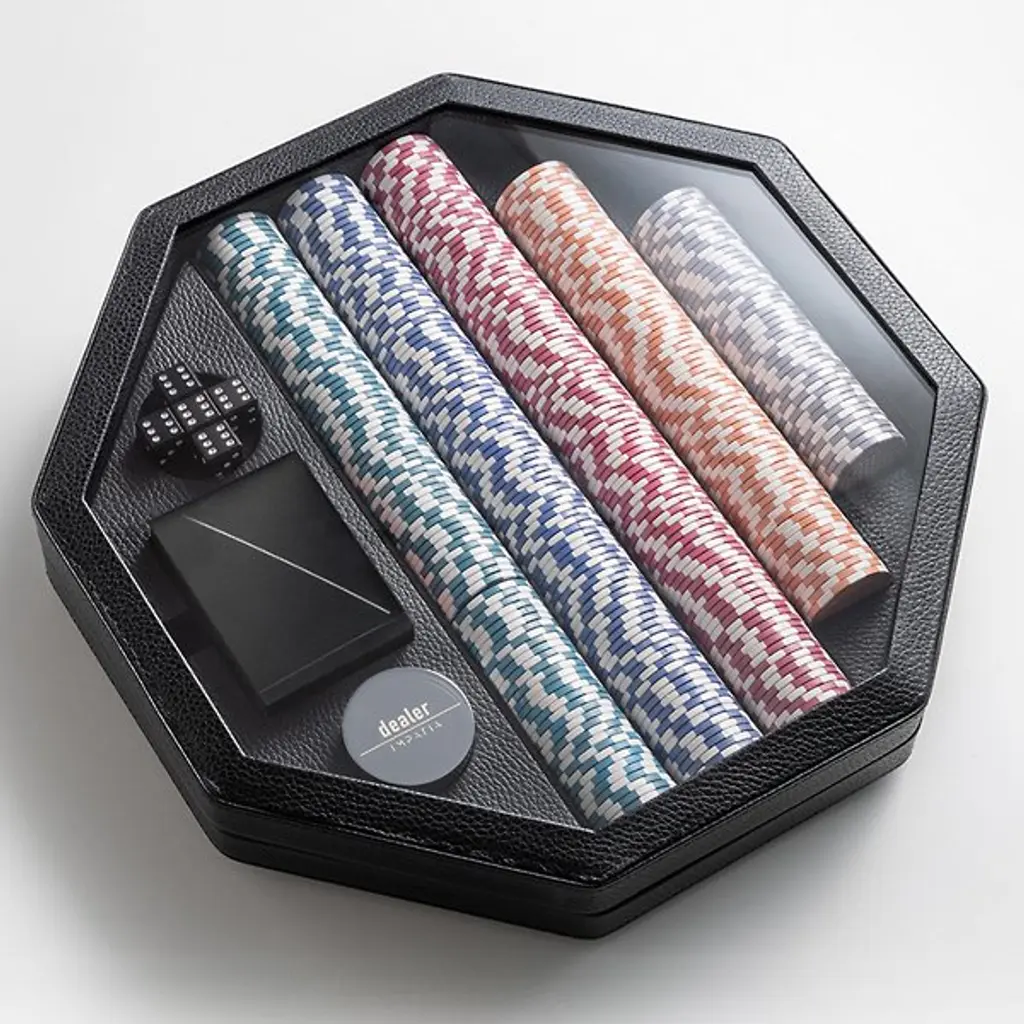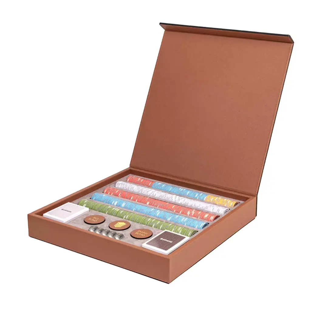 This luxurious case is a perfect idea for a gift and a precious addition to any house. The case in mahogany and walnut wood is secured with a special magnetic closing. The interior is equipped with separate compartments for one deck of high quality playing cards and poker chips with five denominations (all provided). A fine leather cover in bright orange covers the case, giving it a sophisticated appearance. Both color and type of leather can be changed by choosing among the catalog's options.