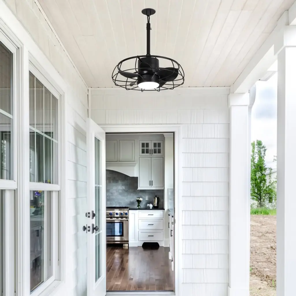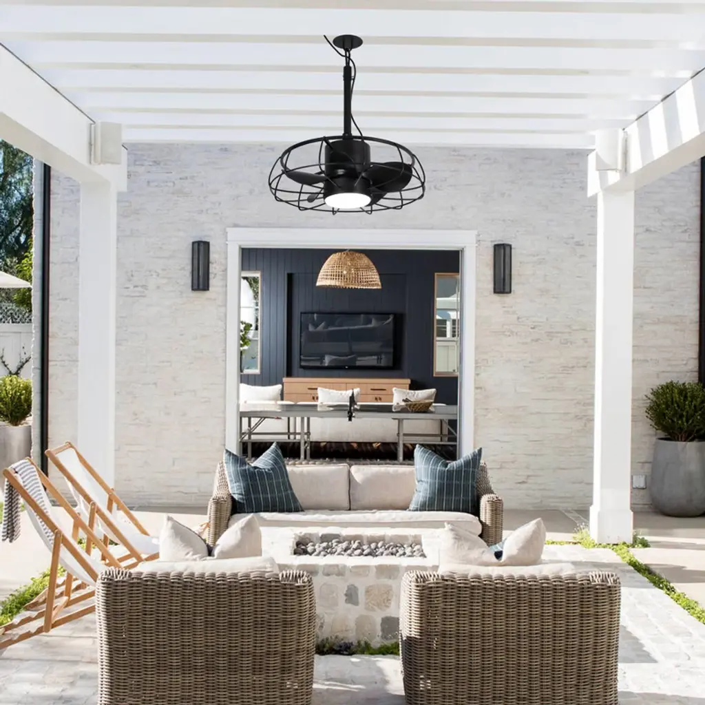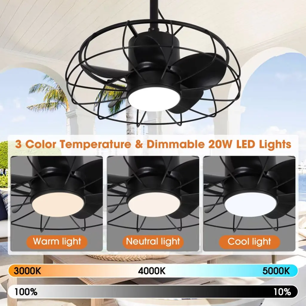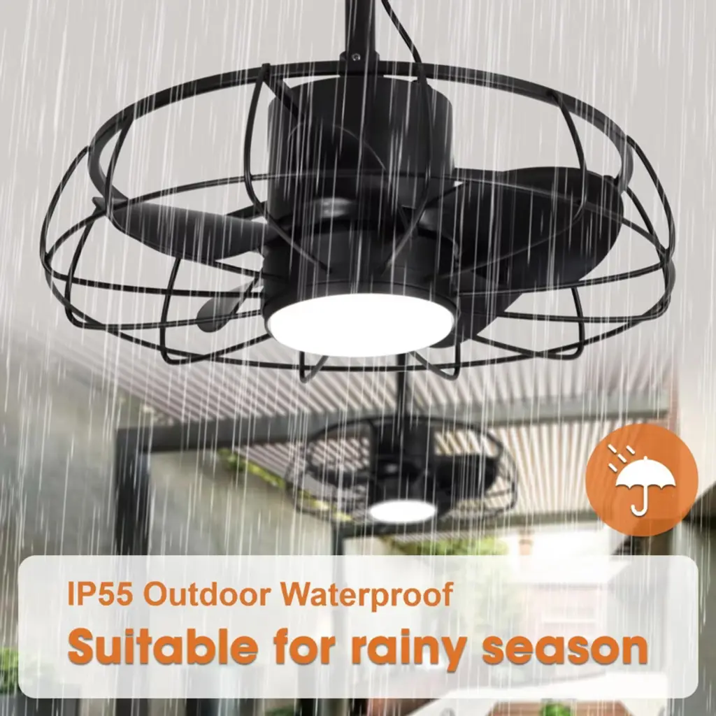 This ceiling fan with a black skeletonized lampshade is the core design element, which retains the cleanliness of modern style and adds a touch of rugged charm through industrial-style design details. The ceiling fan is made of high-quality metal with a special rust-resistant treatment, which, along with its waterproof rating, allows it to easily meet the challenges of semi-outdoor environments such as balconies and terraces. The lighting system is equipped with high-index LED modules, providing 3000 K- 5000 K natural light dual color temperature options, with a maximum brightness of up to 1800 lumens.