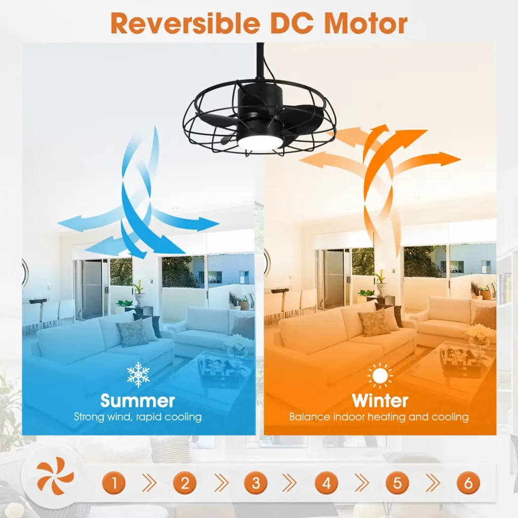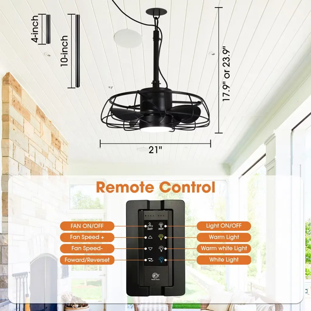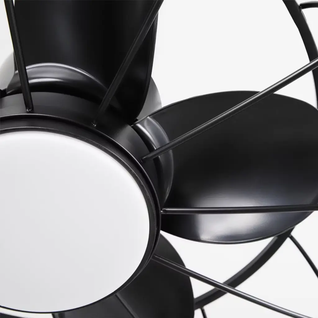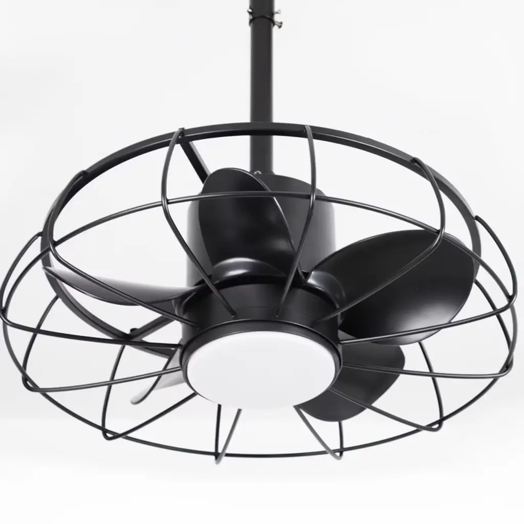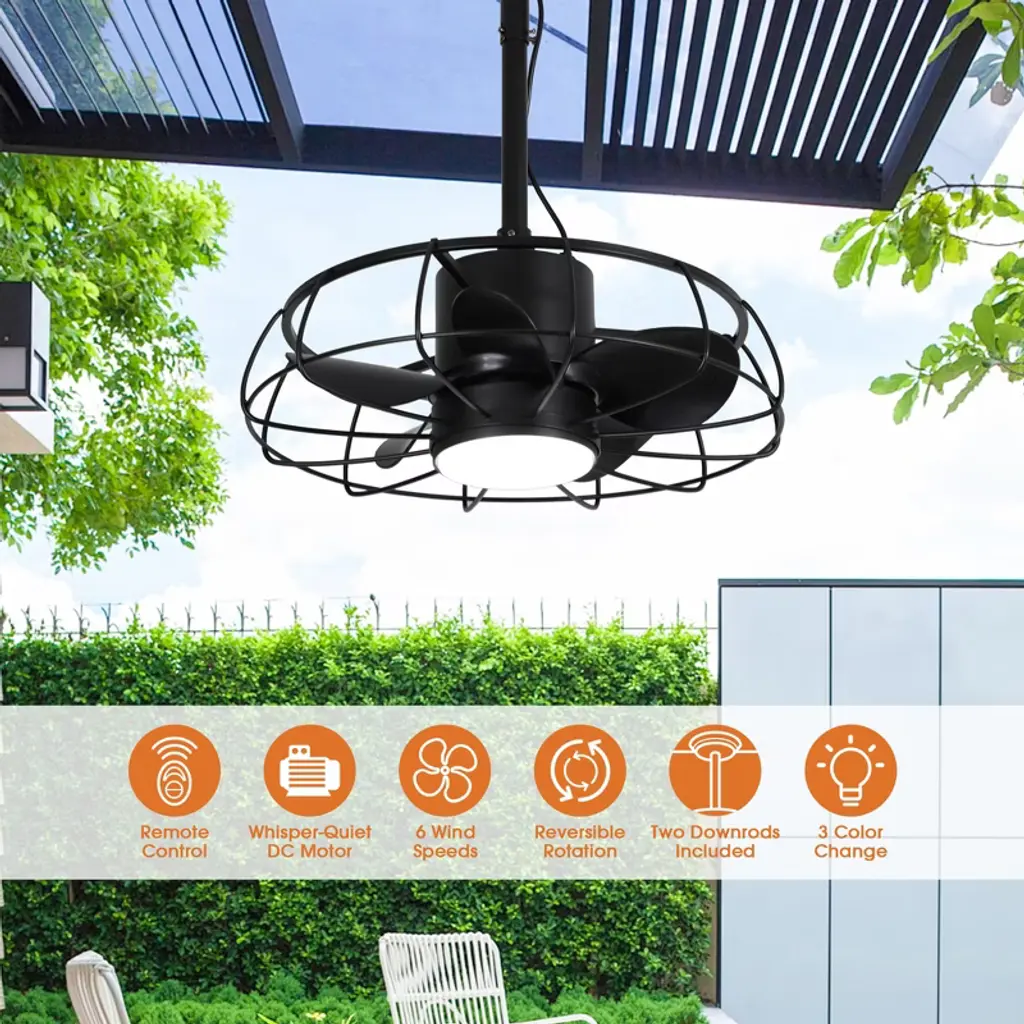 This ceiling fan with a black skeletonized lampshade is the core design element, which retains the cleanliness of modern style and adds a touch of rugged charm through industrial-style design details. The ceiling fan is made of high-quality metal with a special rust-resistant treatment, which, along with its waterproof rating, allows it to easily meet the challenges of semi-outdoor environments such as balconies and terraces. The lighting system is equipped with high-index LED modules, providing 3000 K- 5000 K natural light dual color temperature options, with a maximum brightness of up to 1800 lumens.