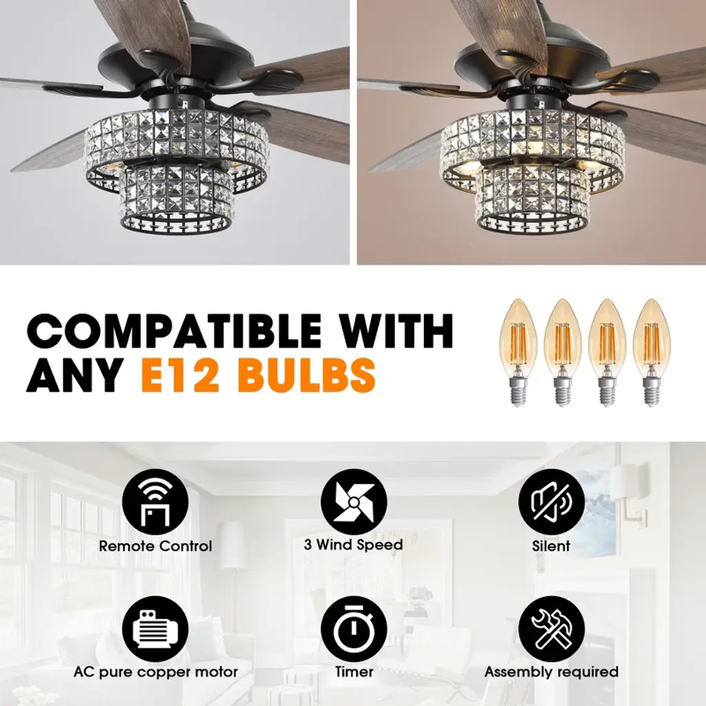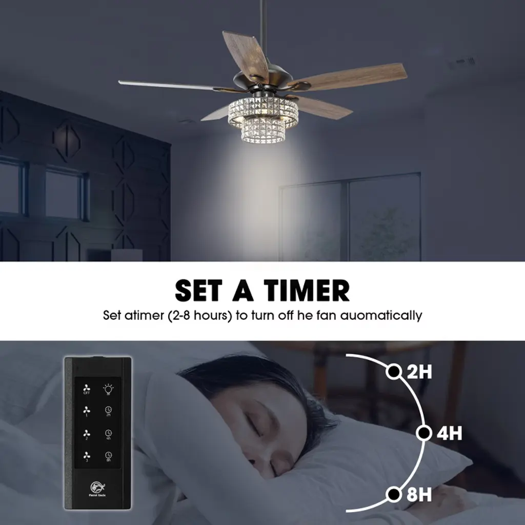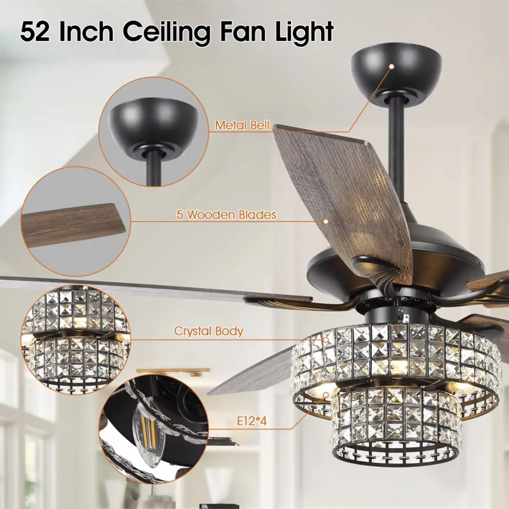 This 52-inch crystal ceiling fan features a contemporary style with 5 fan blades. A handheld remote control is included to control the wind speed and light, and two different lengths of down rods for adjustable hanging height. The powerful motor allows for efficient air circulation and is suitable for most rooms.