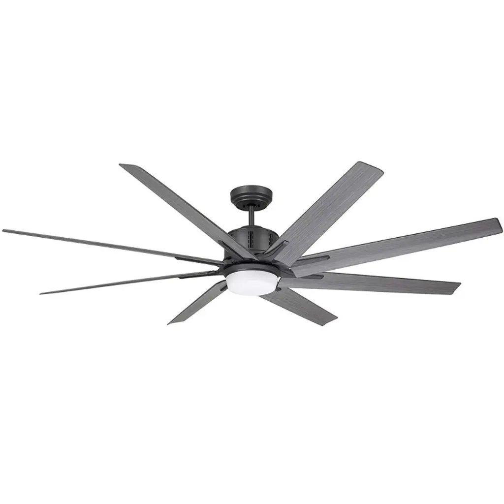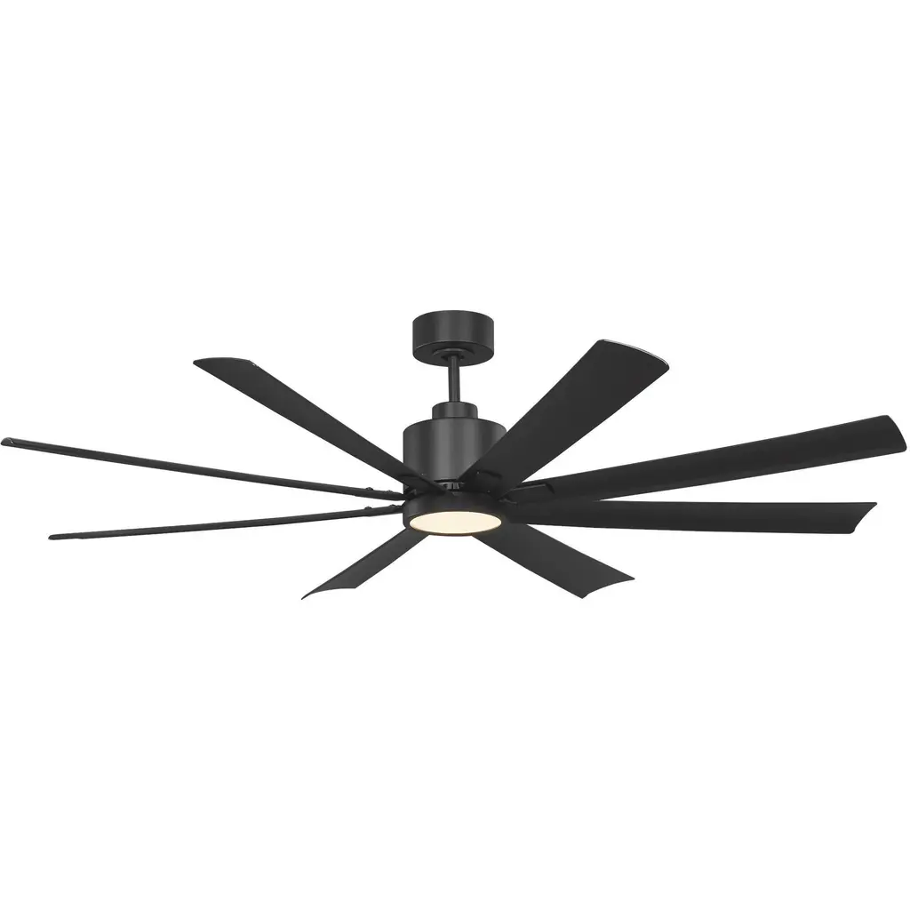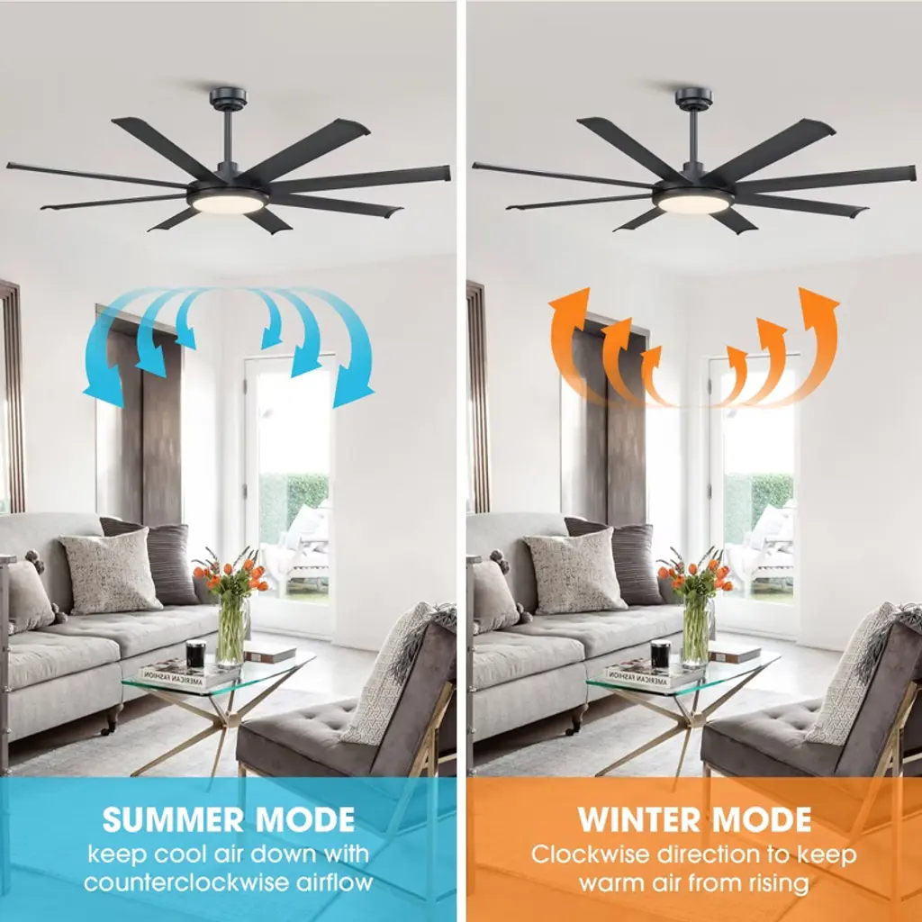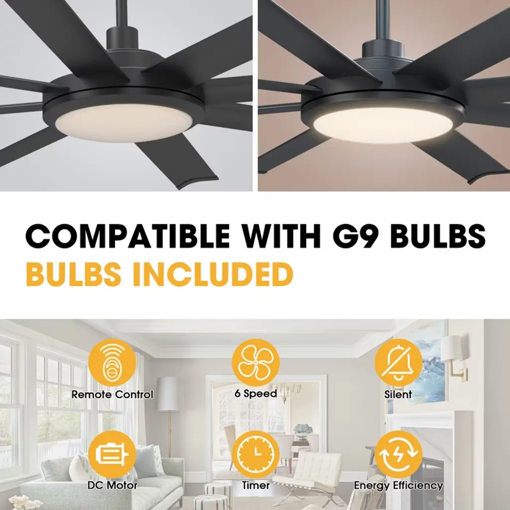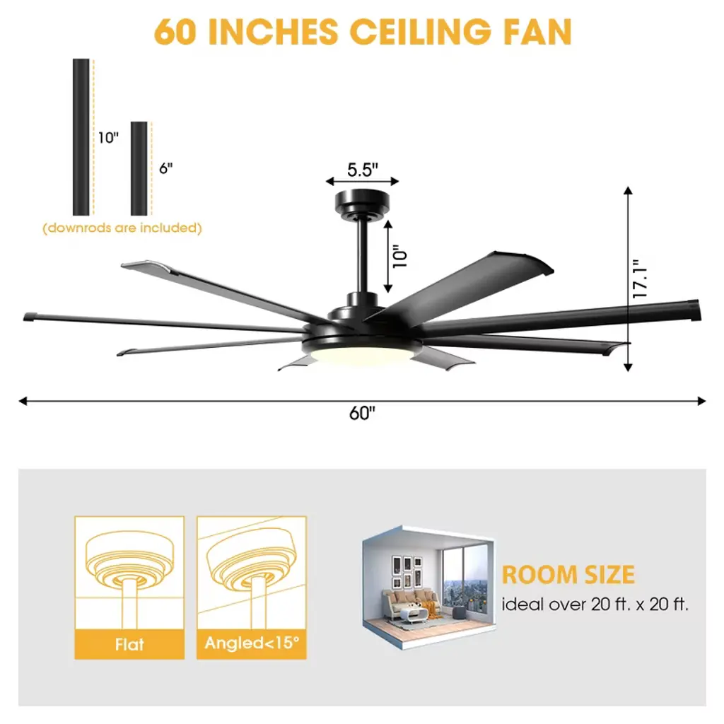 This 60-inch black modern LED ceiling fan features a minimalist design with eight glossy black fan blades for efficient air circulation. Comes with LED integrated bulb with 3000K color temperature.With the included remote control, both the light and fan support remote control for easier use.6-speed wind speed adjustment, suitable for most rooms including office, living room, garage.