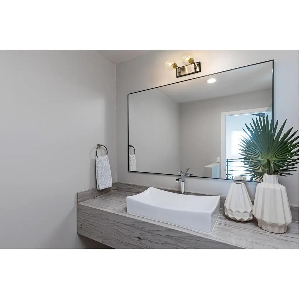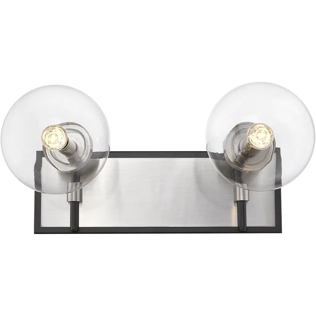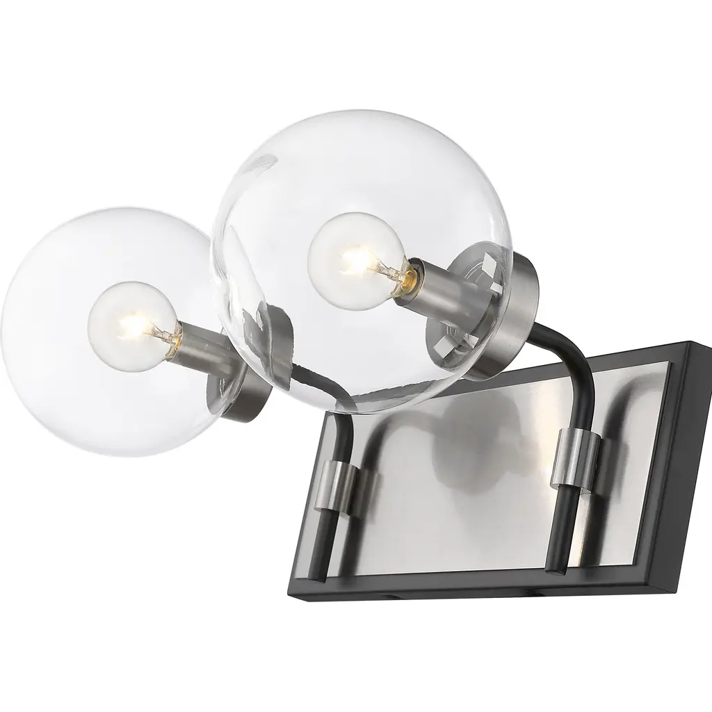Upgrade the ambiance of your home with this clean, crisp two-light vanity. It's crafted with a matte black and brushed nickel finish and clear glass shades that deliver plenty of radiance. It's ideal for a bathroom, powder room, or bedroom with its mix of modern glam and edginess.