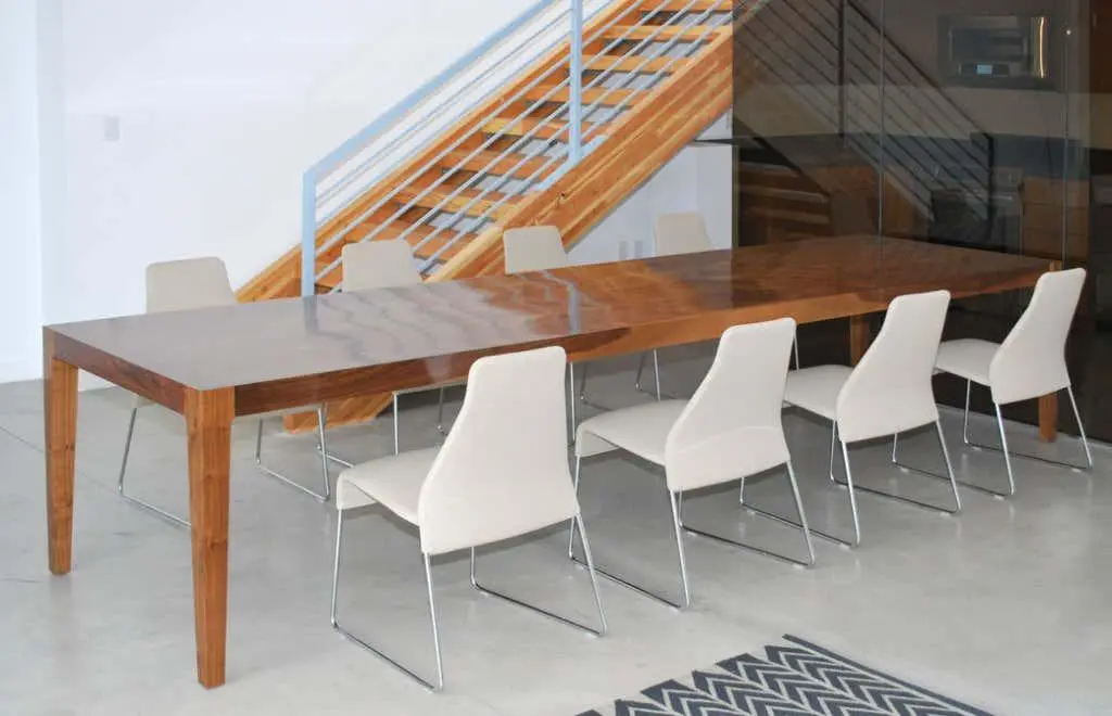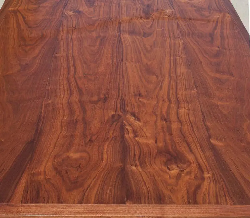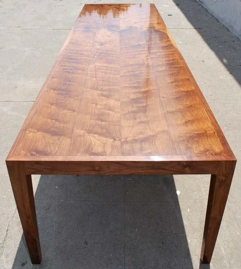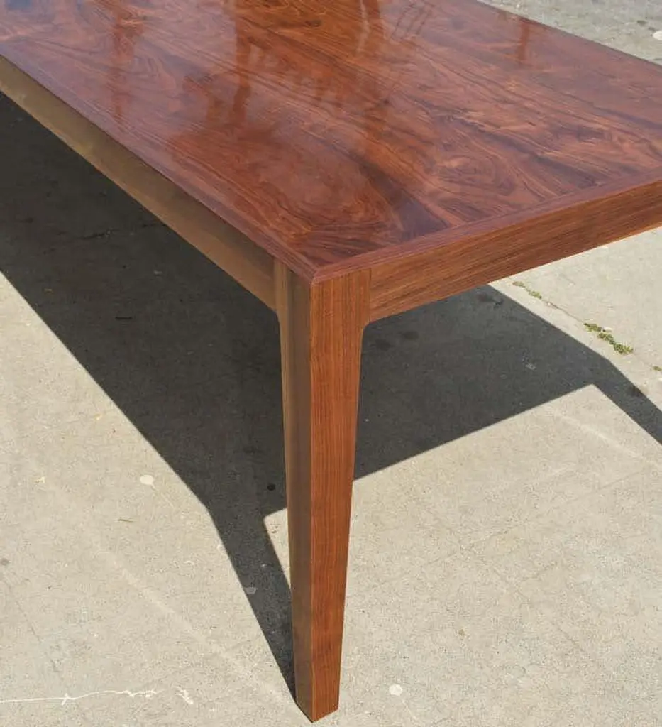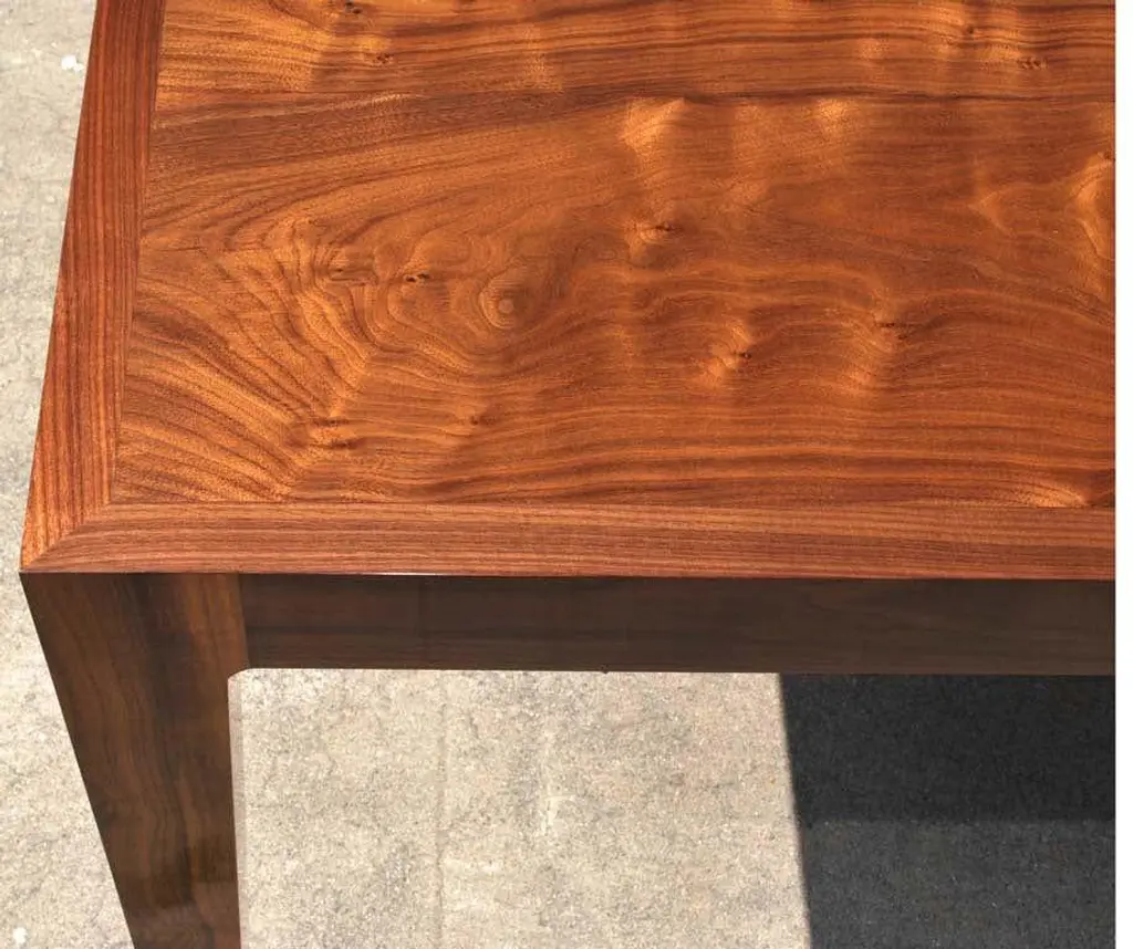 This parsons table is made from solid bookmatched planks of nicely figured walnut (not veneer), beautifully finished for a soft satin feel. We use only traditional carpentry techniques, no nails or metal fasteners of any kind. Just mortise and tenon construction reinforced with hand-cut wooden dowels.