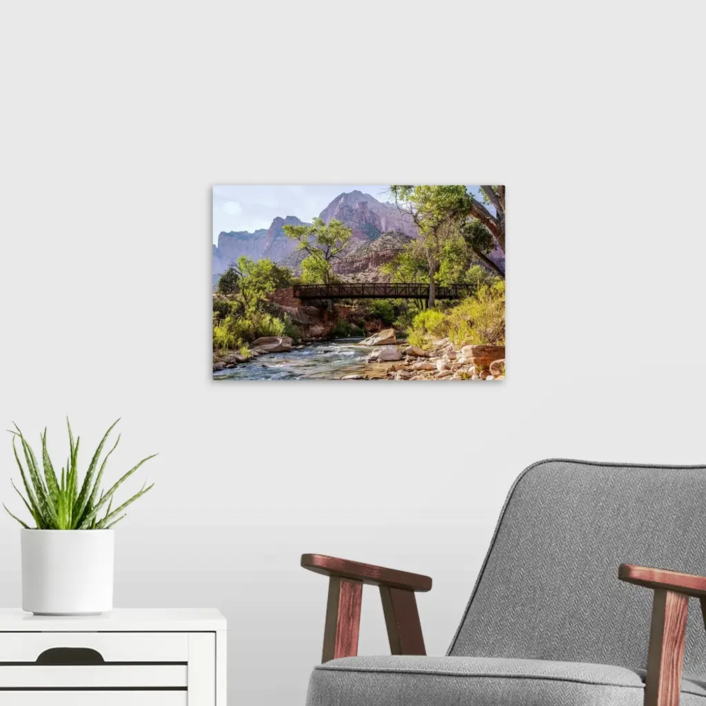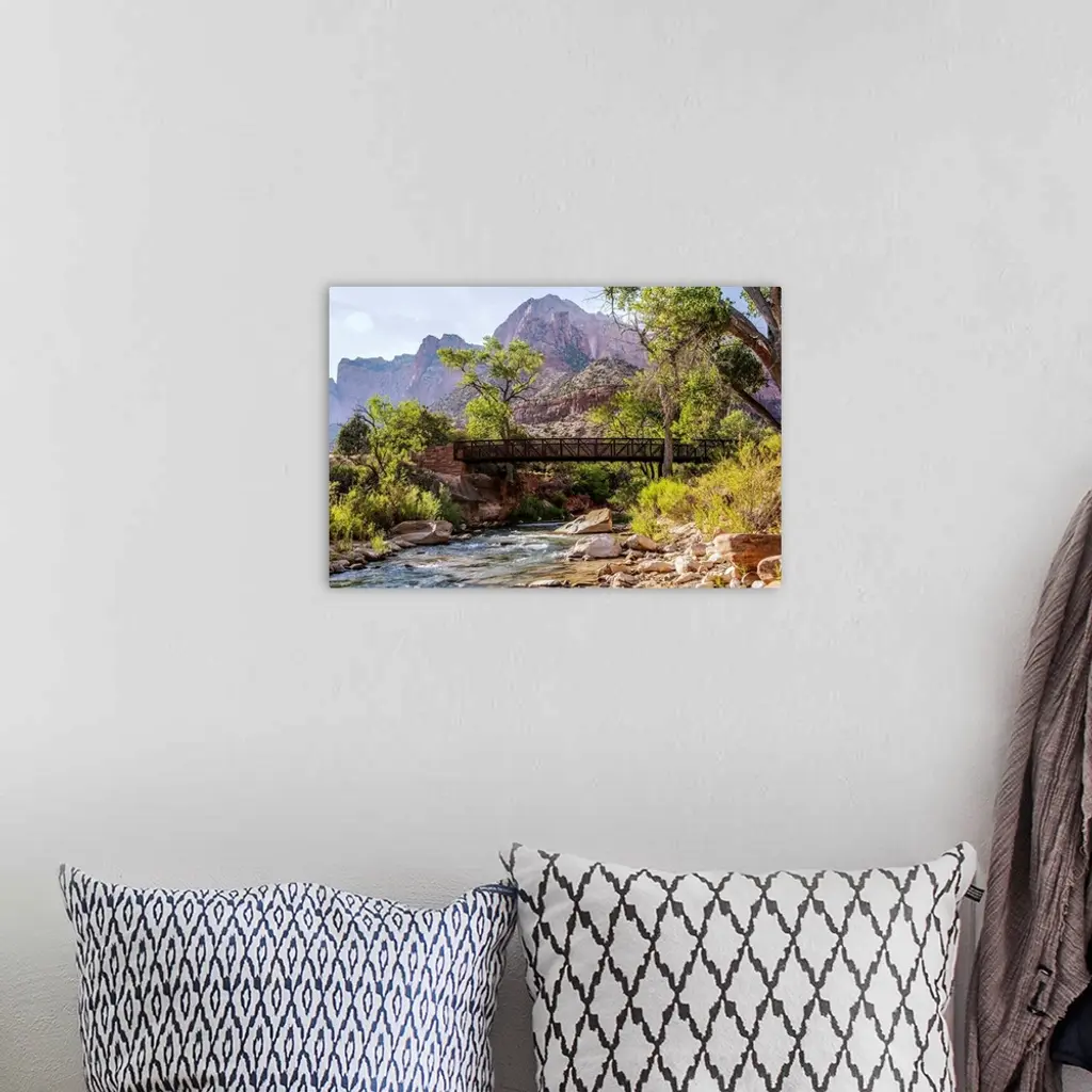 View of a Pa'rus trail bridge over Virgin River in Zion National Park, Utah.
