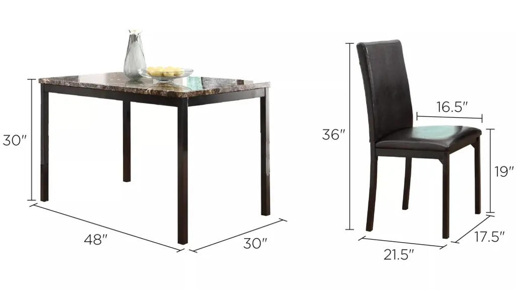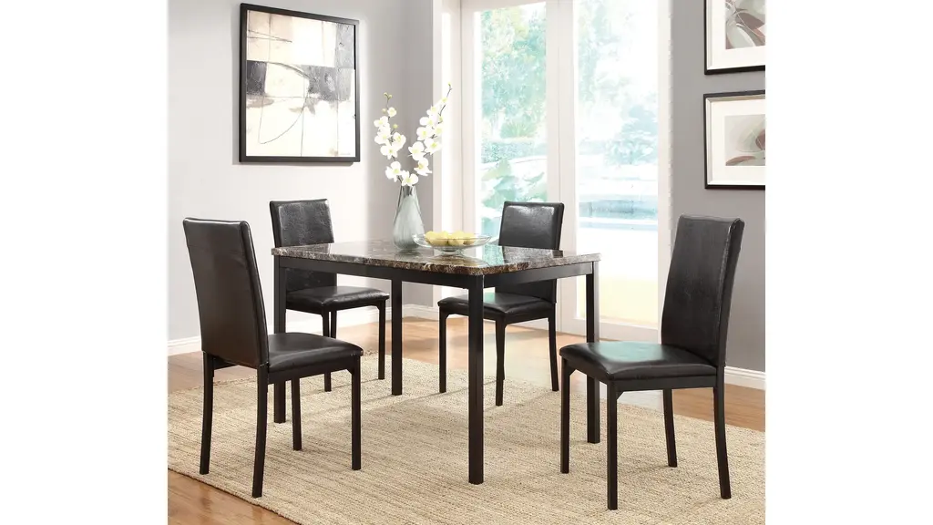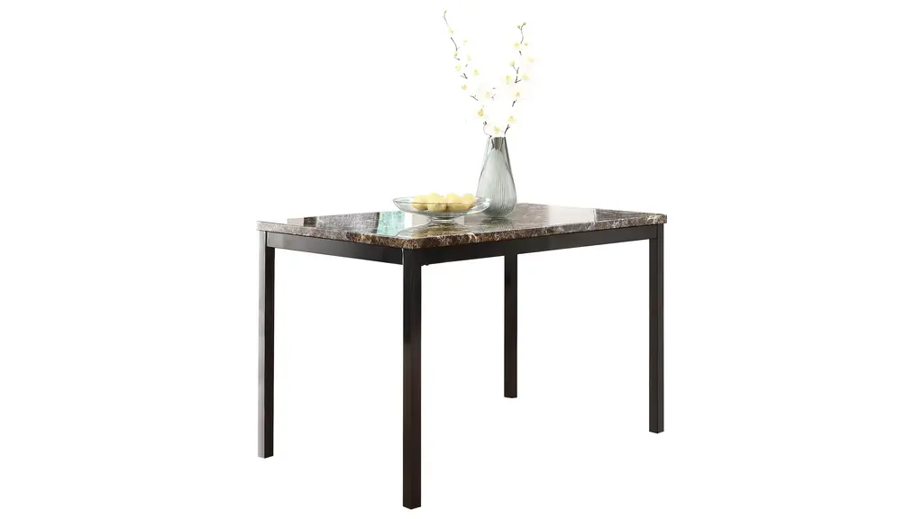 With a scale appropriate for any number of smaller dining spaces, the Paseo 5-pc. dining set will provide the look and style you want in your home. The transitional feel of the group comes from the richly hued faux marble table top and the minimalistic design of the dark brown bi-cast vinyl chairs. The table and chair are constructed of metal in black finish. The collection is available in counter or traditional dining heights.
