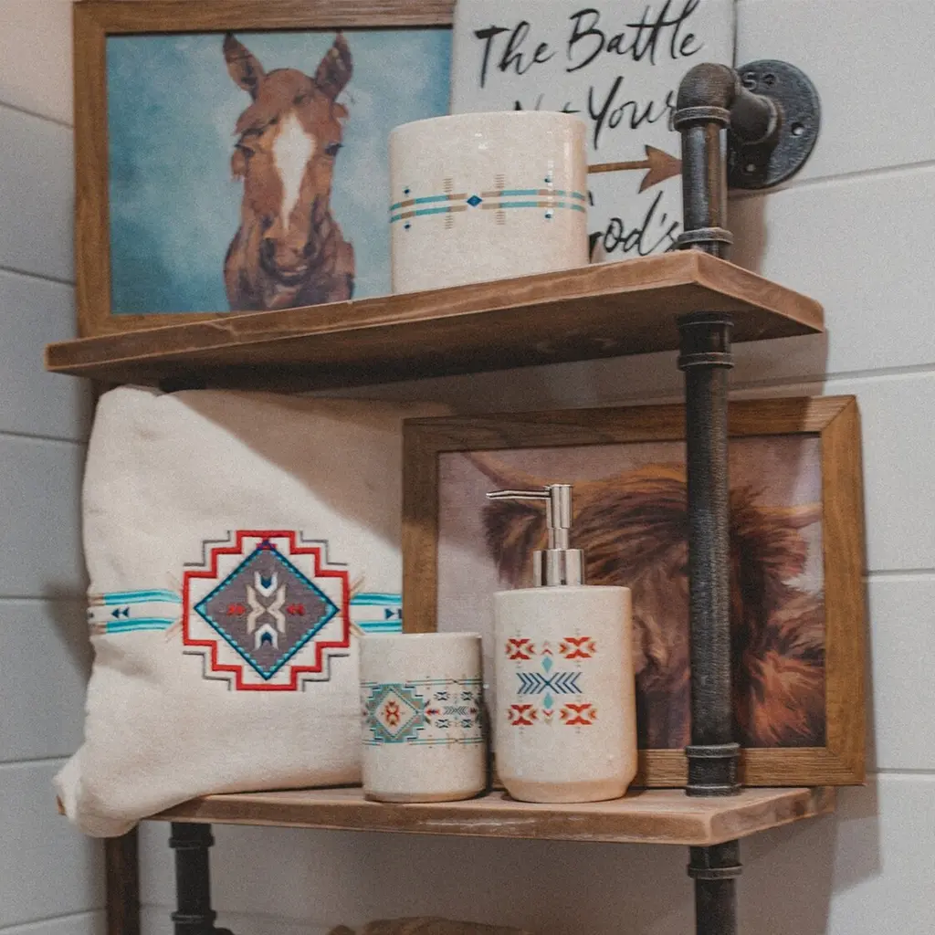 Showcasing bold geometric patterns in striking earth tones, our Spirit Valley Ceramic Vanity Set inspires a vibrant Southwestern flair in your bathroom. These patterns are set atop a taupe background, speckled with paint flecks for an artisanal pottery look. Complete a sophisticated Southwestern-style bathroom when you coordinate with other bathroom pieces in our Spirit Valley Collection. What's Included 1 Soap/Lotion Dispenser + 1 Toothbrush Holder + 1 Tumbler Dimensions Materials Ceramic Care Wipe clean.Why Paseo Road by HiEnd Accents?About Paseo Road by HiEnd Accents At Paseo Road, we’re driven by our desire to create bedding and home décor that celebrates the history, heritage, and endless beauty of the rustic world. Our Dallas-based design team creates authentic rustic designs that you won’t find anywhere else. From traditional styles to modern rustic renditions, we're proud to be known as a leading designer of Western, Southwestern, Aztec, lodge, and cabin bedding sets and home décor for all seasons.