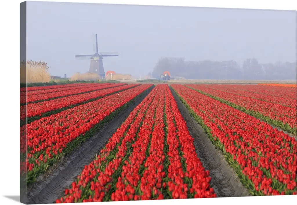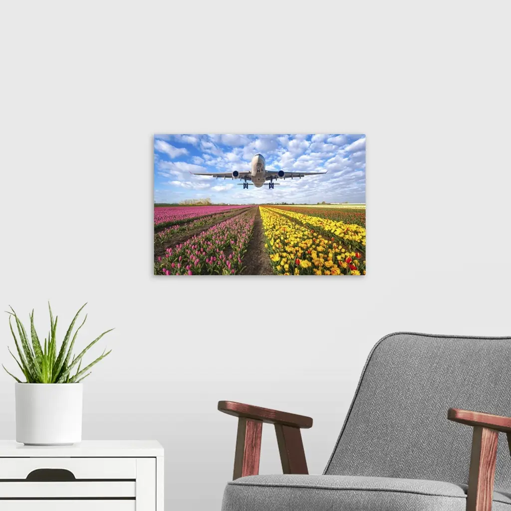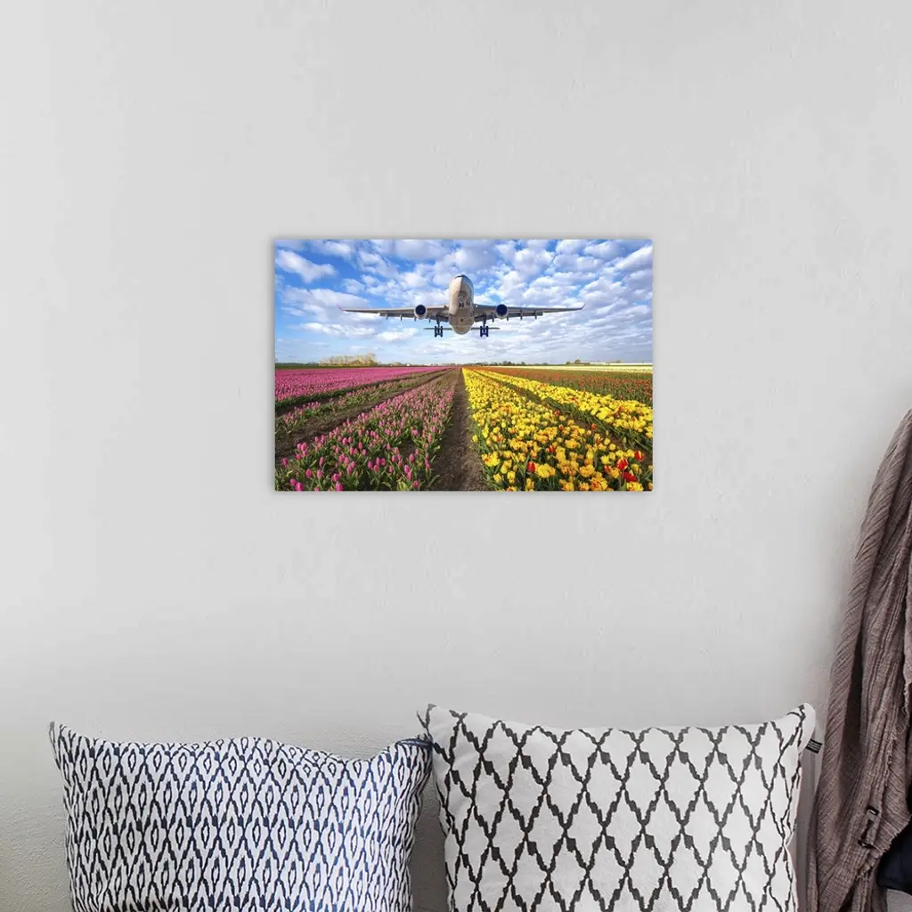 Passenger Airplane Flying Over Tulip Field At Sunset, Netherlands