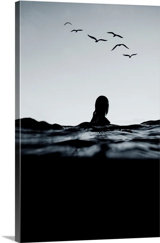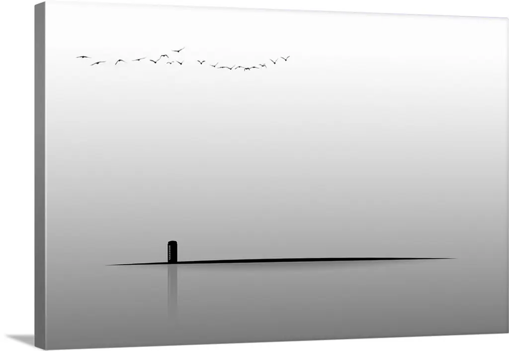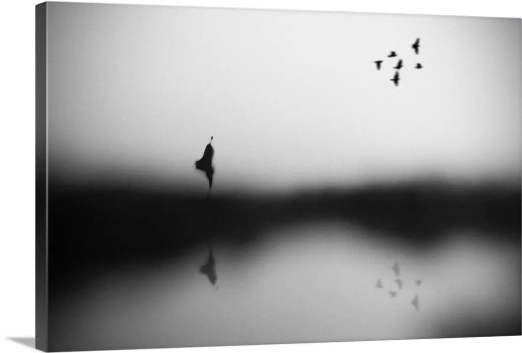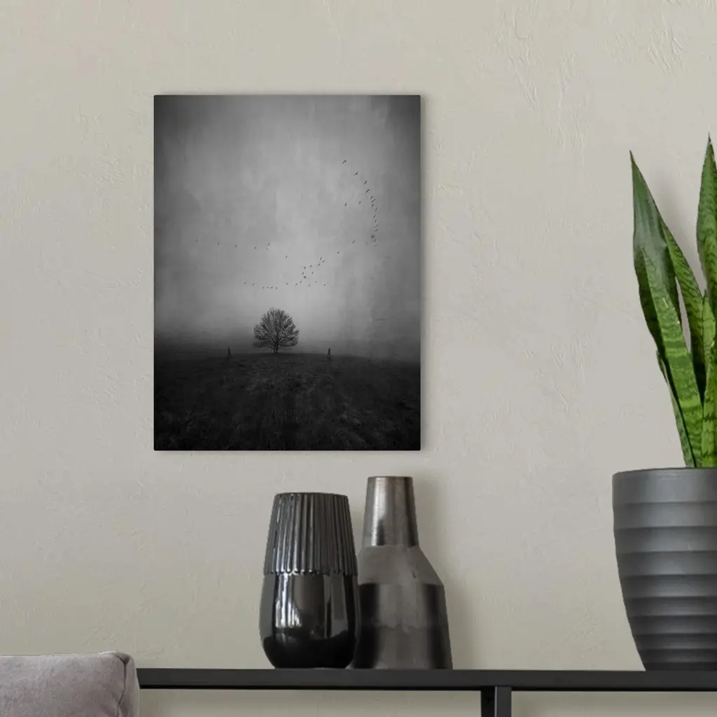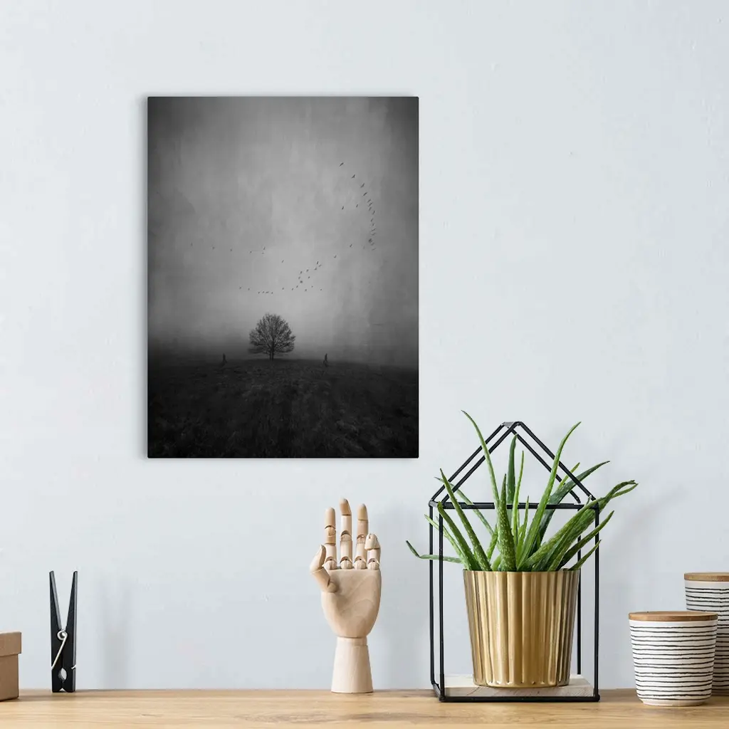 Silhouettes of two persons walking away from each other and a lonely tree in a strange and further empty landscape
