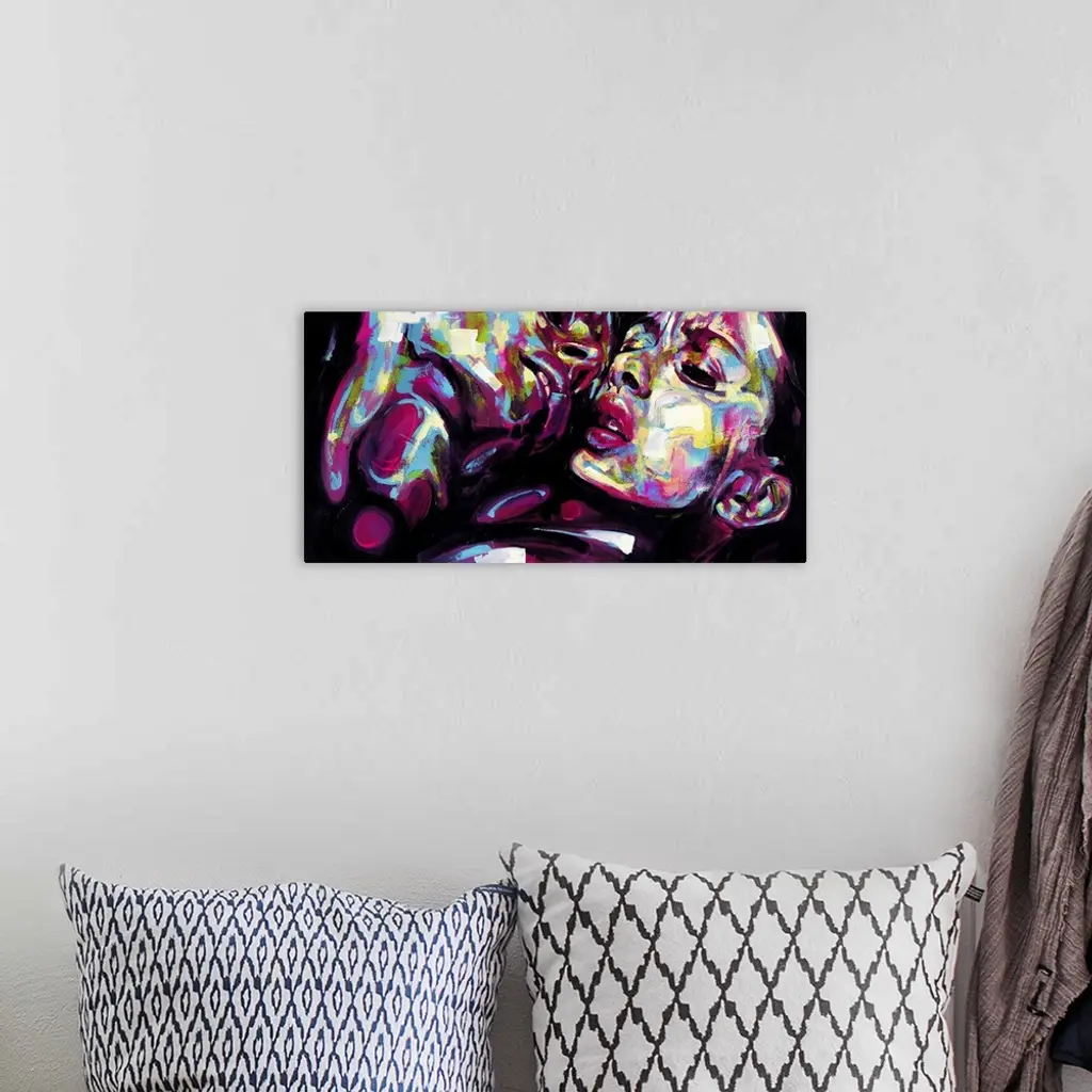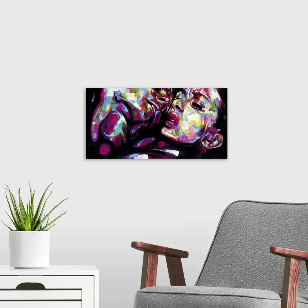 Horizontal abstract portrait of a man and woman in vibrant colors.