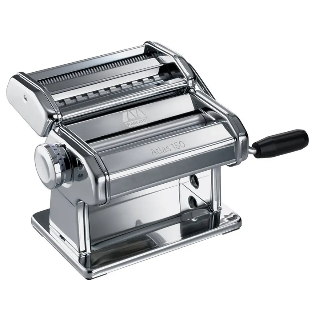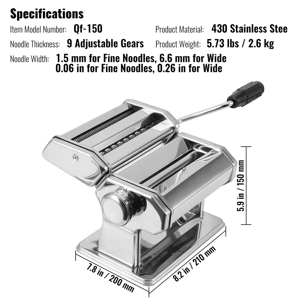Food-Grade Material and Cleaning Method: Tired of noodle machines that have a metallic or plastic odor? This pasta maker machine is made from food-grade materials. The blade attachments should not be washed with water or placed in a dishwasher. Residual moisture can affect the sharpness of the blades and shorten the machine's lifespan. We recommend using the included cleaning brush for convenience. The entire body can be wiped with a dry cloth or brush to clean off any remaining flour. 9-Level Thickness Adjustment: The noodles maker features a custom-adjustment knob with 9 thickness settings for the dough rollers. You can choose the desired thickness according to your needs, with a maximum thickness of 0.1 inch. By simply adjusting the thickness, you can alter the texture and taste of the pasta. Additionally, by continuously pressing the dough, you can obtain dumpling wrappers with a thickness of up to 0.01 inch (0.3 millimeters), impressing your family and friends with your excellent cooking skills. Different Blades for Different Flavors: A stainless steel noodle rollers and cutter has two types of cutting blades: Blade A and Blade B. Blade A can cut noodles into two different widths: 0.06 inch or 0.26 inch. Blade B can cut noodles into two different widths: 0.12 inch or 1.77 inch. It is highly suitable for making angel hair pasta, spaghetti, wide noodles, dumpling wrappers, wonton wrappers, and more, meeting various pasta-making needs. Capable of Making Various Types of Pasta: This pasta making kitchen tool kit allows you to create a variety of pasta dishes. You can use it to make angel hair pasta, spaghetti, lasagna, or other types of pasta. It can also be used to make dumpling wrappers and wonton wrappers, allowing you to enjoy a wide range of fresh homemade pasta with your family. Alternate Use (for Electric option): The electric noodle machine can not only automatically produce noodles with a motor, but also assemble a hand crank to make noodles by hand. The former can make you more worry free and effortless, while the latter can allow you to experience the joy of handmade things! Electric option Package Content 1 x Pasta Maker Machine 1 x Cleaning Brush 1 x BladeA 1 x BladeB 1 x Table Clamp 1 x Manual Crank Manual one blade option Package Content 1 x Pasta Maker Machine 1 x Cleaning Brush 1 x BladeA 1 x Table Clamp 1 x Manual Crank Manual two blades option Package Content 1 x Pasta Maker Machine 1 x Cleaning Brush 1 x BladeA 1 x BladeB 1 x Dumpling Accessory 1 x Dumpling Wrapper Cutter 1 x Table Clamp 1 x Manual Crank