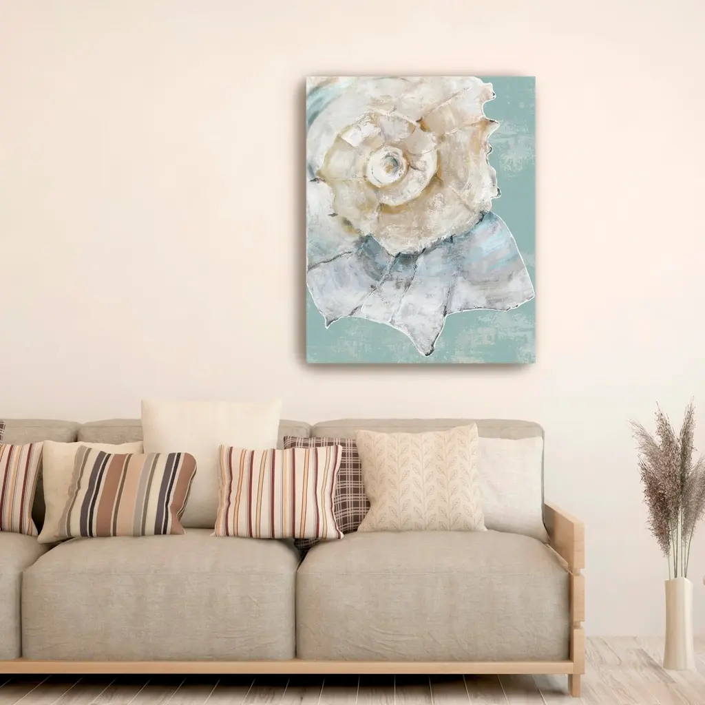 Bring the beauty of the ocean into your home with this enchanting canvas art print, featuring an array of delicate sea shells that evoke the tranquility of coastal living. The soft, soothing colors and intricate details create a serene atmosphere, making it a perfect addition to any space.Available in black frame, dark walnut frame and oak frames, or as a frameless canvas. Our Gallery Wrap Canvas Prints are proudly assembled with high quality materials in California, USA. Each piece is printed on a thick, archival grade canvas using Giclee technology. It is then hand-stretched by our experienced artisans over solid pine bars, which will not warp over time. The final product is a piece personally crafted for you to confidently display on your wall. Care and Assembly: Ensure that the location of your piece has little to no exposure to heat, sunlight, and moisture. Wipe clean, only if needed. Each piece includes a sawtooth hanger to hang on your wall vertically.