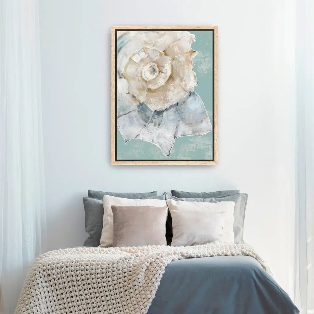 Bring the beauty of the ocean into your home with this enchanting canvas art print, featuring an array of delicate sea shells that evoke the tranquility of coastal living. The soft, soothing colors and intricate details create a serene atmosphere, making it a perfect addition to any space.Available in black frame, dark walnut frame and oak frames, or as a frameless canvas. Our Gallery Wrap Canvas Prints are proudly assembled with high quality materials in California, USA. Each piece is printed on a thick, archival grade canvas using Giclee technology. It is then hand-stretched by our experienced artisans over solid pine bars, which will not warp over time. The final product is a piece personally crafted for you to confidently display on your wall. Care and Assembly: Ensure that the location of your piece has little to no exposure to heat, sunlight, and moisture. Wipe clean, only if needed. Each piece includes a sawtooth hanger to hang on your wall vertically.