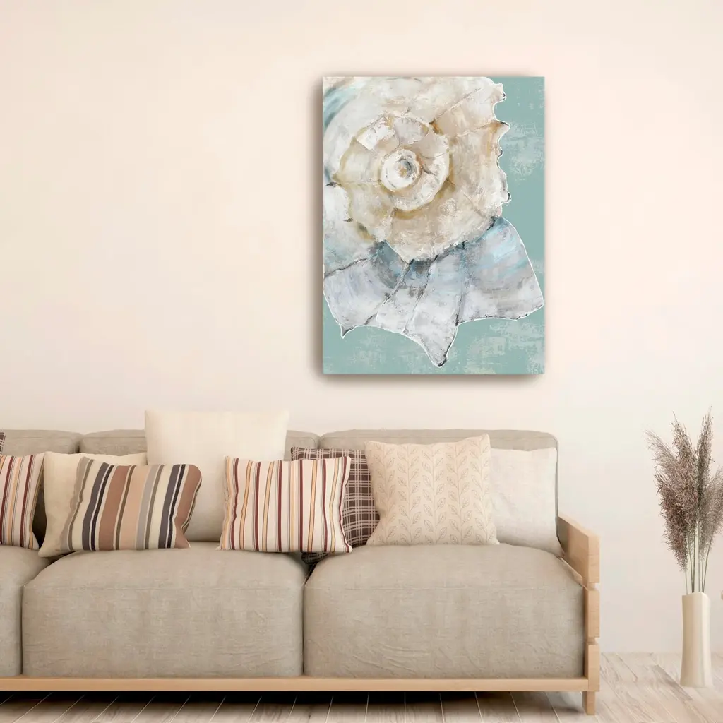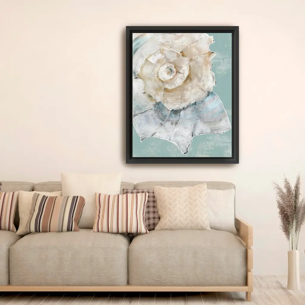 Bring the beauty of the ocean into your home with this enchanting canvas art print, featuring an array of delicate sea shells that evoke the tranquility of coastal living. The soft, soothing colors and intricate details create a serene atmosphere, making it a perfect addition to any space.Available in black frame, dark walnut frame and oak frames, or as a frameless canvas. Our Gallery Wrap Canvas Prints are proudly assembled with high quality materials in California, USA. Each piece is printed on a thick, archival grade canvas using Giclee technology. It is then hand-stretched by our experienced artisans over solid pine bars, which will not warp over time. The final product is a piece personally crafted for you to confidently display on your wall. Care and Assembly: Ensure that the location of your piece has little to no exposure to heat, sunlight, and moisture. Wipe clean, only if needed. Each piece includes a sawtooth hanger to hang on your wall vertically.
