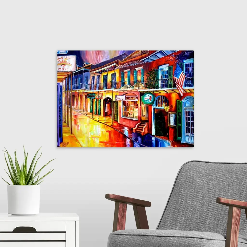 Big contemporary art shows a row of vibrantly colored buildings reflecting off of the water soaked surface on a quiet street in Louisiana at night.