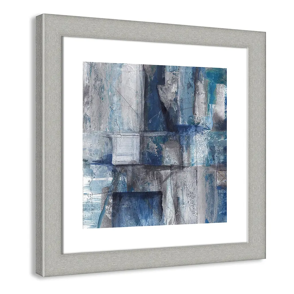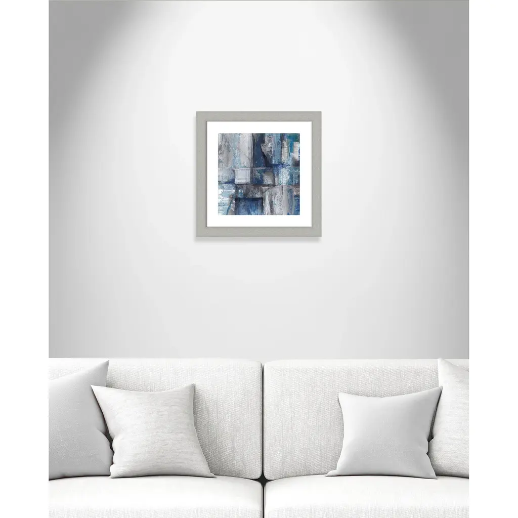 Patchwork Abstract I', an alluring abstract image featuring a cool palette of grays and blues, combines geometry and breathtaking detail to create an industrial, modern effect. This piece features an organic quality with textured brushstrokes and imperfect lines to create a gallery quality touch for your home or office. Finished in a modern frame made of PS materials, this is the perfect addition to your walls. Archival fine art giclée print on acid-free and lignin-free 100% cotton rag paper; image includes a bright white self-matting border Printed with gallery-quality inks using the finest giclée print technology for unsurpassed color gamut and clarity Lightweight and finished under shatter-resistant acrylic; hanging hardware attached for easy and secure installation Handcrafted in the USA and ships with a Certificate of Authenticity Lightweight and finished under shatter-resistant acrylic