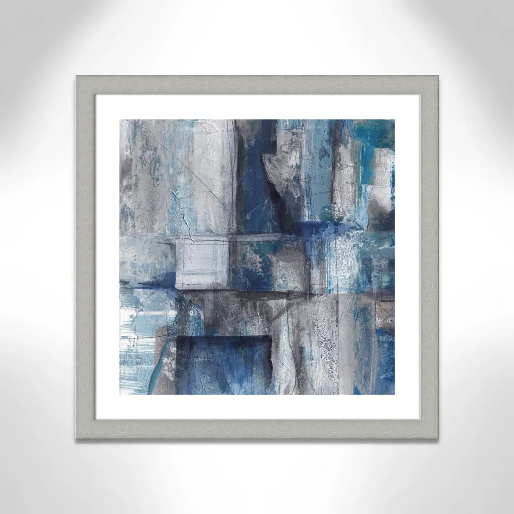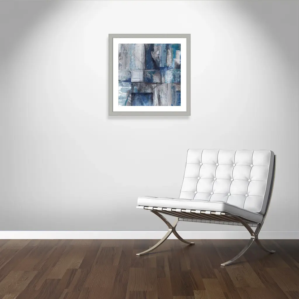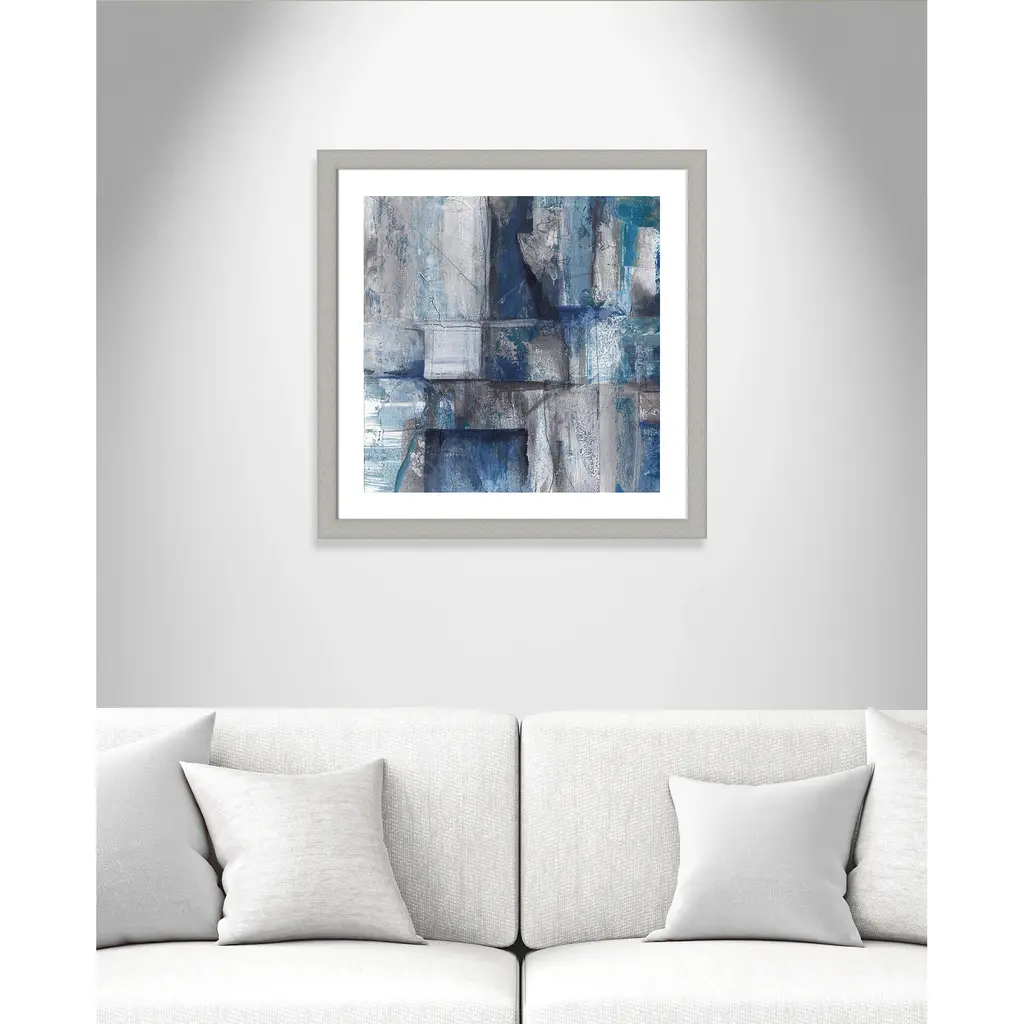 Patchwork Abstract I', an alluring abstract image featuring a cool palette of grays and blues, combines geometry and breathtaking detail to create an industrial, modern effect. This piece features an organic quality with textured brushstrokes and imperfect lines to create a gallery quality touch for your home or office. Finished in a modern frame made of PS materials, this is the perfect addition to your walls. Archival fine art giclée print on acid-free and lignin-free 100% cotton rag paper; image includes a bright white self-matting border Printed with gallery-quality inks using the finest giclée print technology for unsurpassed color gamut and clarity Lightweight and finished under shatter-resistant acrylic; hanging hardware attached for easy and secure installation Handcrafted in the USA and ships with a Certificate of Authenticity Lightweight and finished under shatter-resistant acrylic