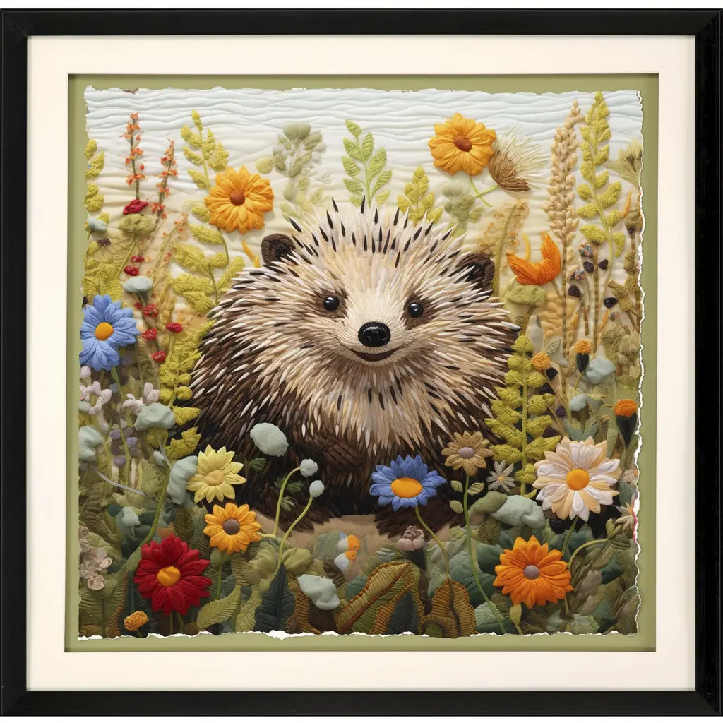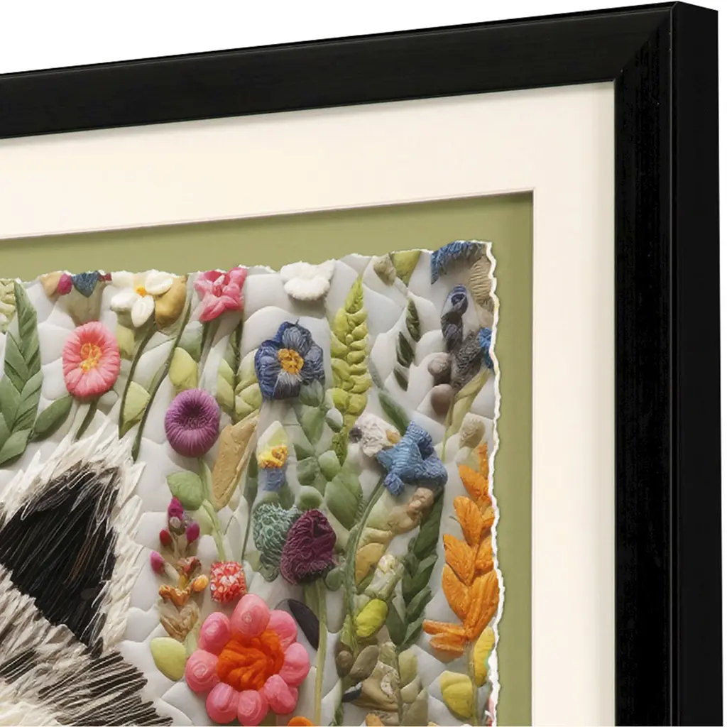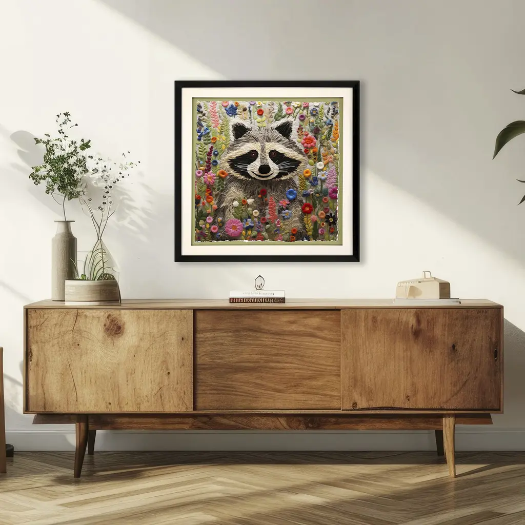 A sassy racoon watches from the garden. Hand deckled and mounted on bayberry with raised white matting. Framed in a shadow box moulding in black.