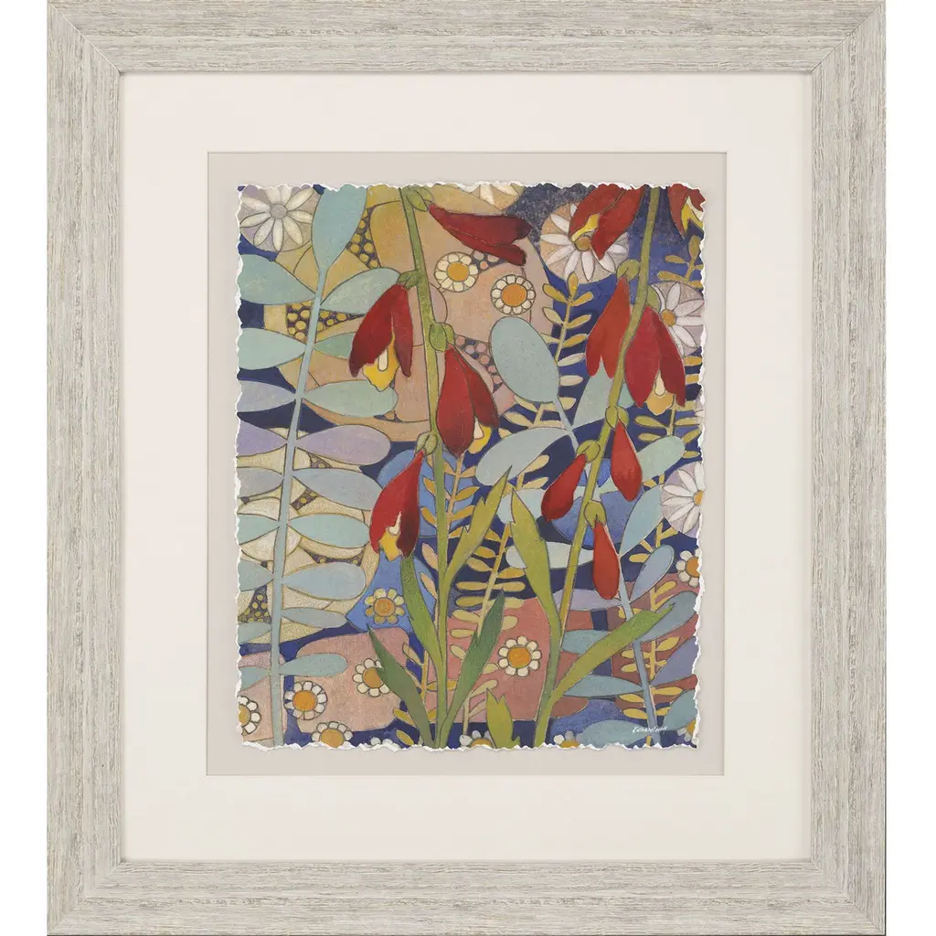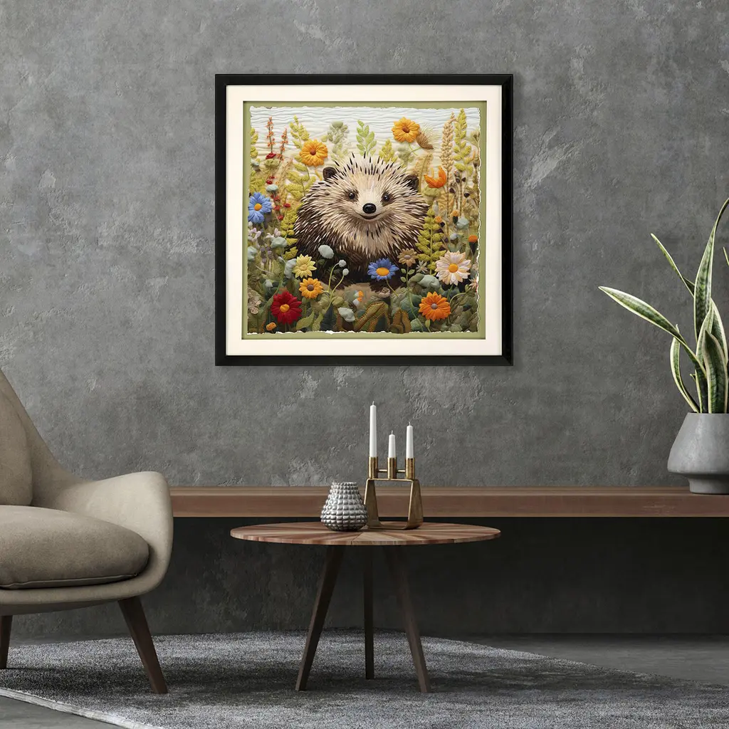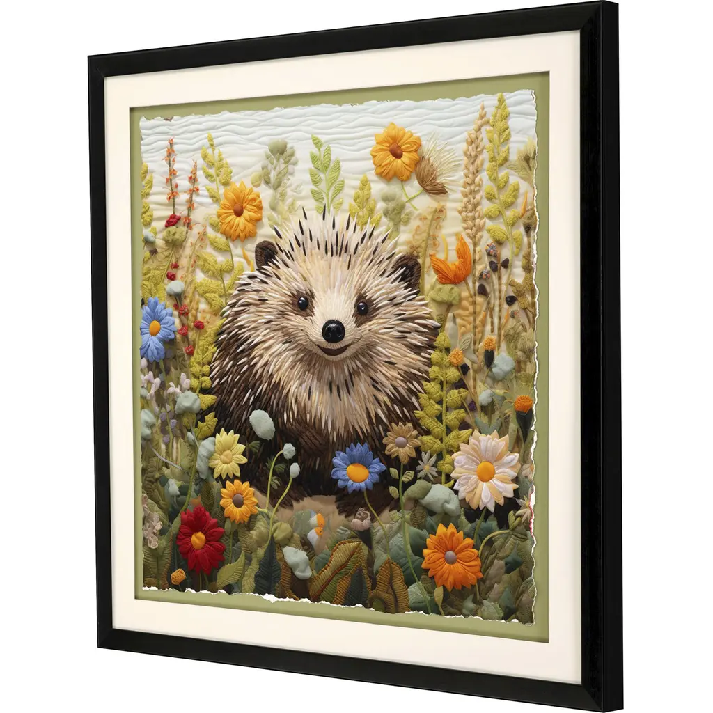 A sassy hedgehog watches from the garden. Hand deckled and mounted on bayberry with raised white matting. Framed in a shadow box moulding in black.