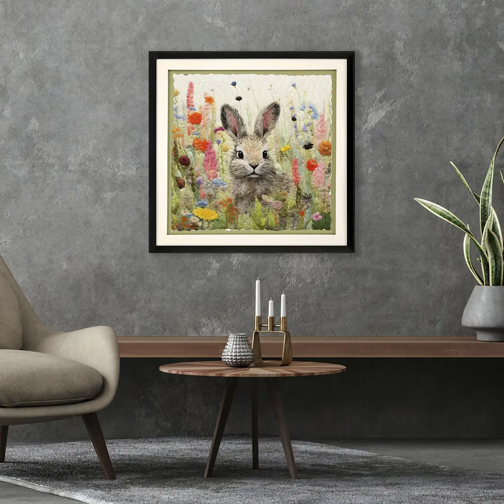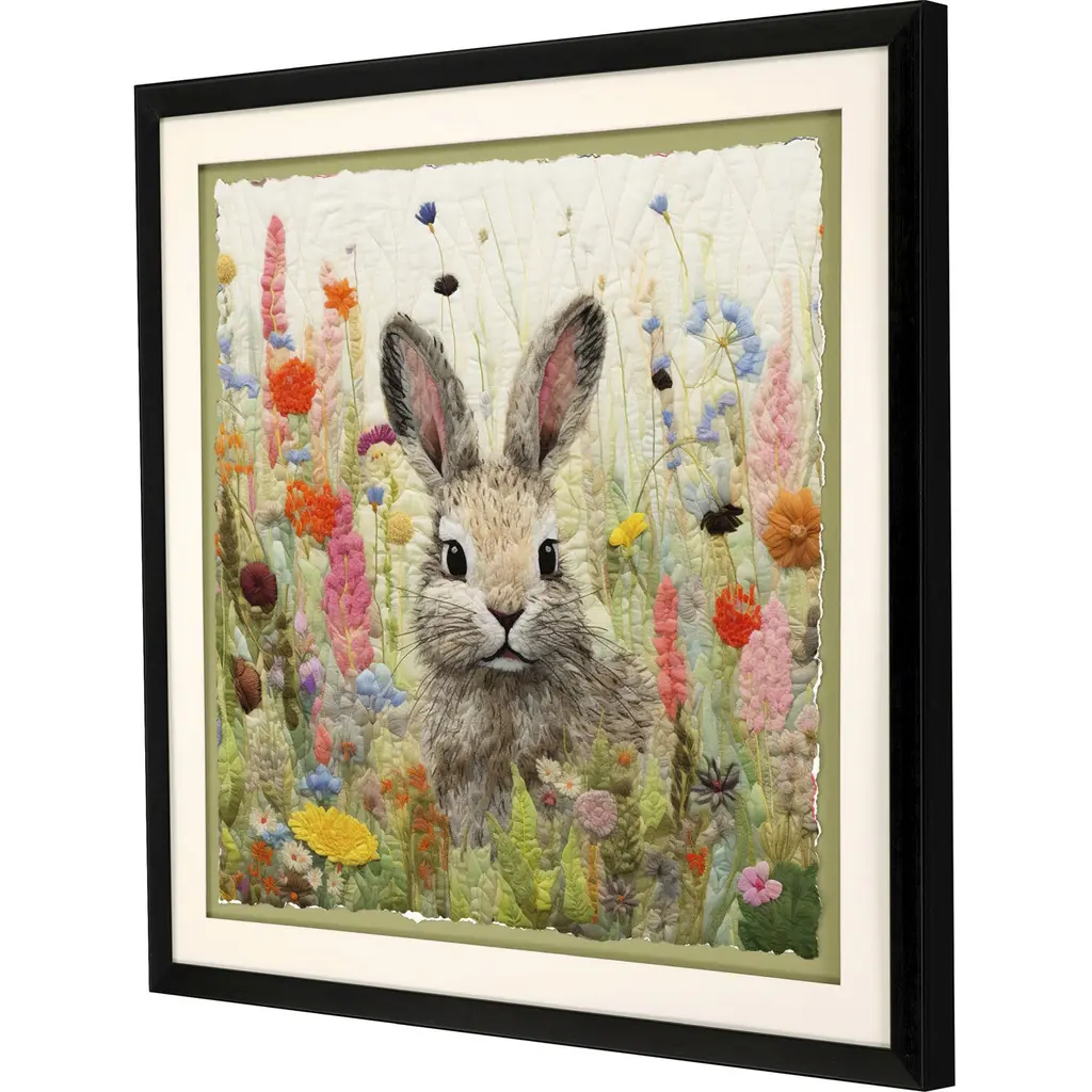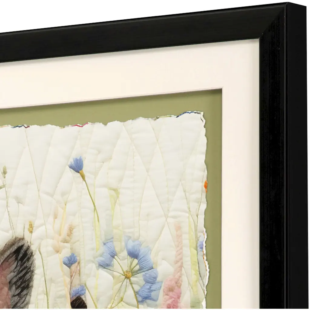 A sassy rabbit watches from the garden. Hand deckled and mounted on bayberry with raised white matting. Framed in a shadow box moulding in black.