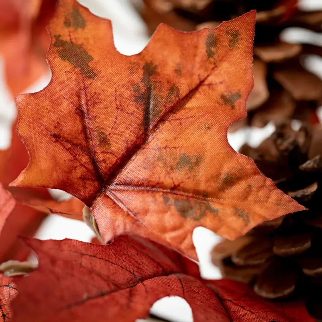 Capture the splendor of a brisk october stroll with our fall maple foliage pick. Dried, leafy textures in colors of rust, amber, and gold are accented with rich brown, mini pinecones. It's instant autumn to display right through to thanksgiving.