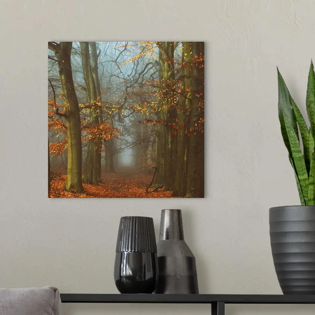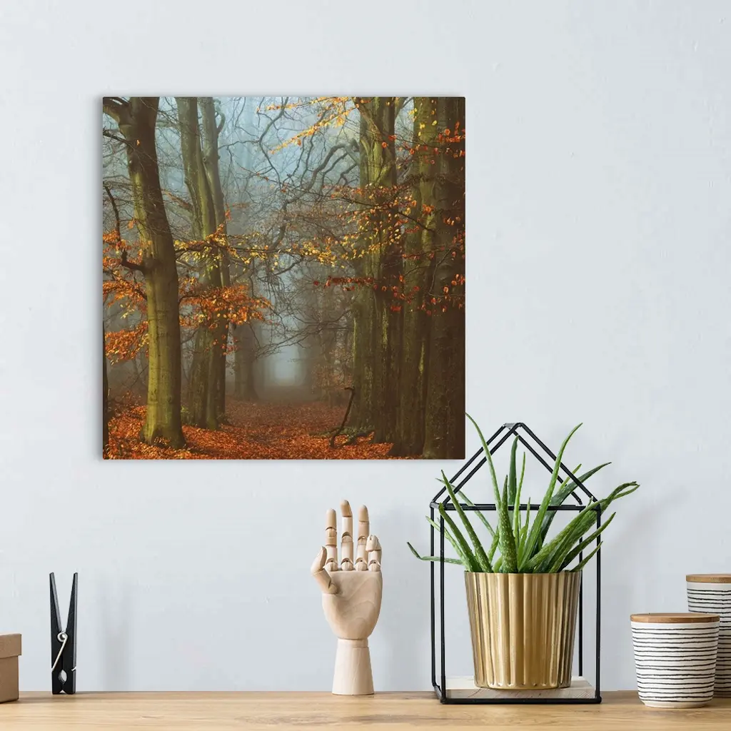 A photograph of a forest in autumn foliage looking down a foggy path.