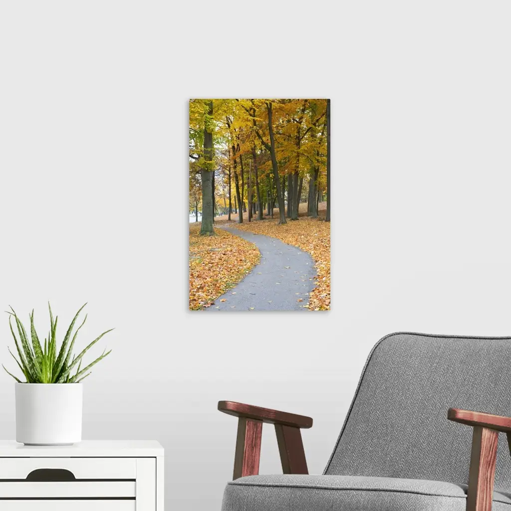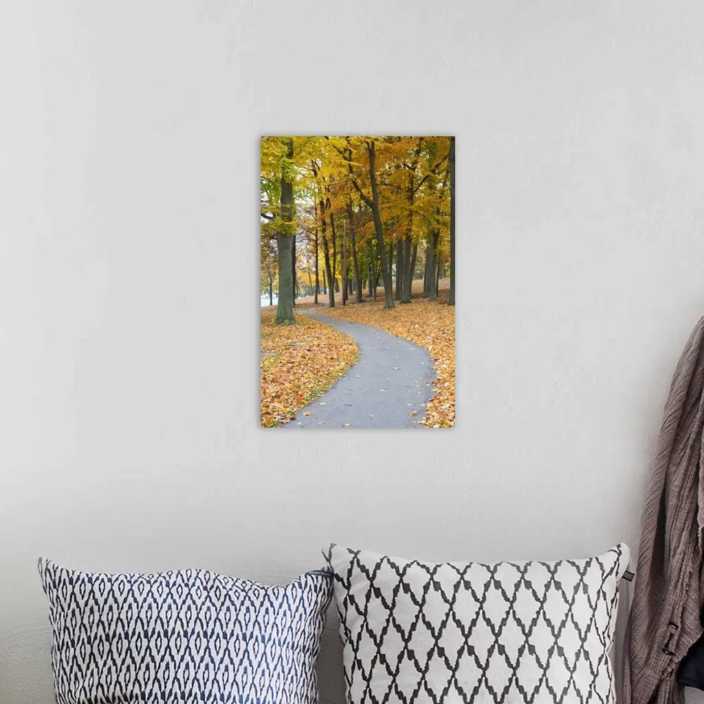 A large vertical piece of a path winding through trees during the autumn with leaves covering the ground beside it.