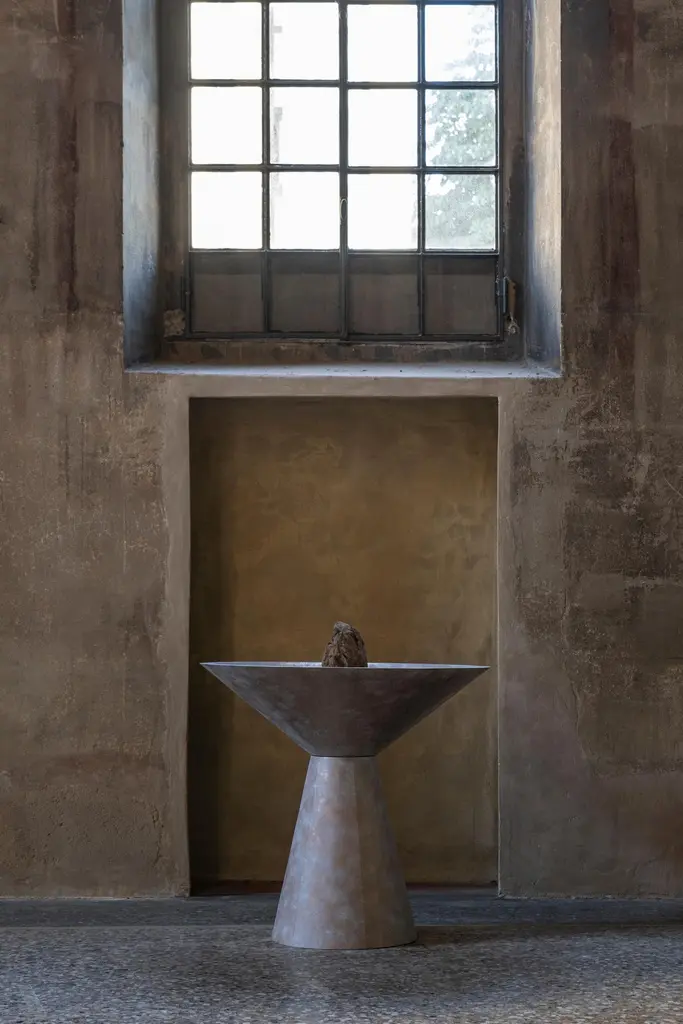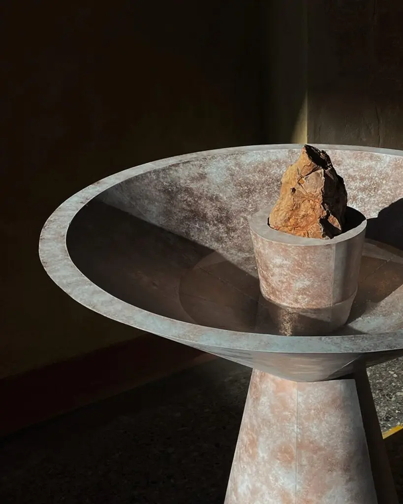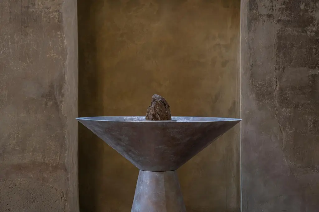 Fountain With Stone, Pertrified Wood by Pierre De ValckOne of a kindDimensions: W 110 x D 110 x H 100 cm.Materials: Stone, Petrified wood, white patinated bronze.Fountain with stone (Pertrified Wood). White patinated bronzeProvenance: Forest of Trooz, Liège, Belgium. Circa 55 million years old.Pierre De ValckPierre De Valck (1991) born in Brussels, is a Ghent-based designer with a childhood fascination for archeology and collecting historical artefacts. His furniture attempts to harness the power of ancient geological processes in a contemporary bodice. Modern antiquities that allow the rediscovery of an ancestral past.Pierre De Valck manually encrusts each piece of furniture with unique minerals and stones of exceptional historical value. Leaving the minerals untouched, the mere functional is transcended, rendering the pieces both unique and authentic testimonies of our collective memory.
