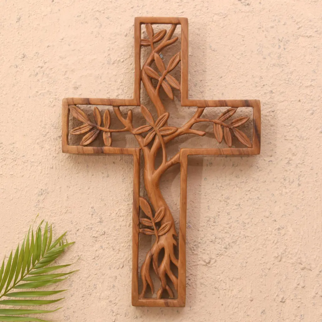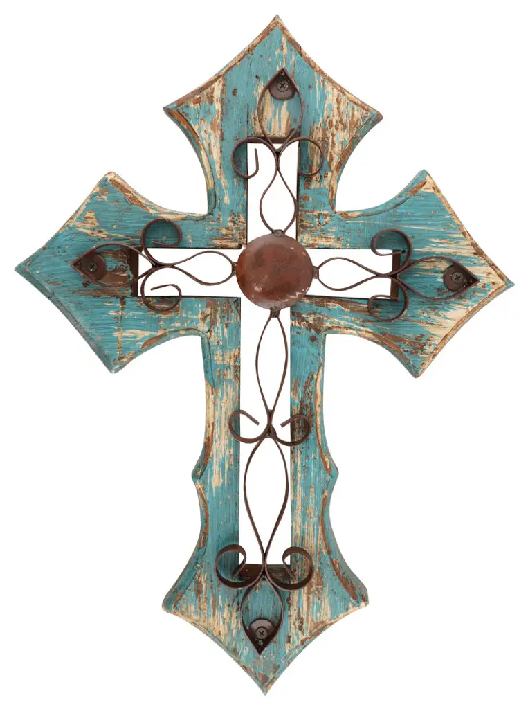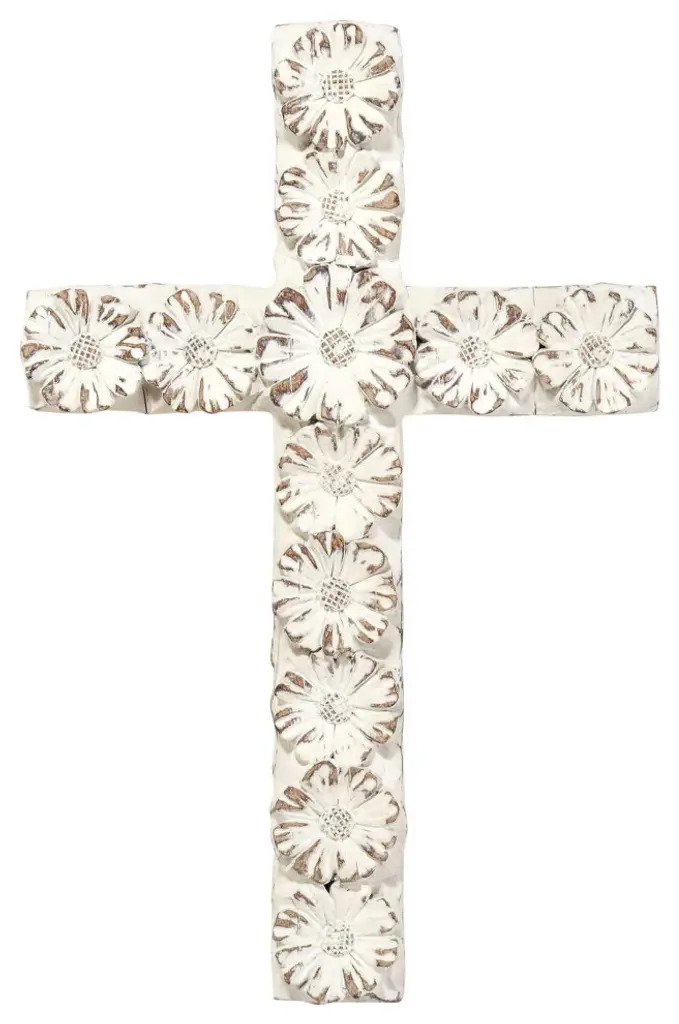 Metal wall cross has ornate open design; metal is finished with the look of a well aged patina. Beautiful triple blossom medallion accents the center. Height of cross is 19".