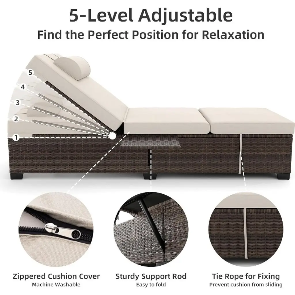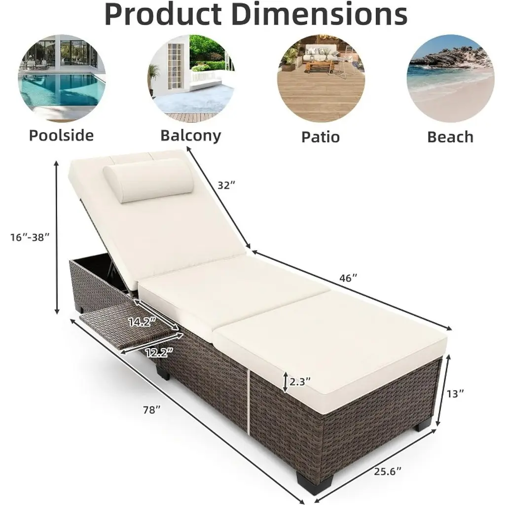 Patio Lounge Chairs Set of 2, Outdoor Wicker Rattan Patio Pool Lounge Chair with 6 Position Adjustable Backrest, Foldable Plate, Cushions and Headrest