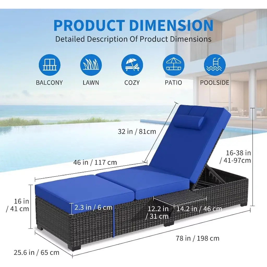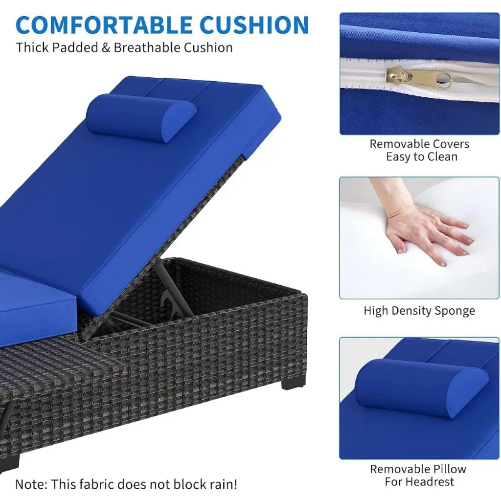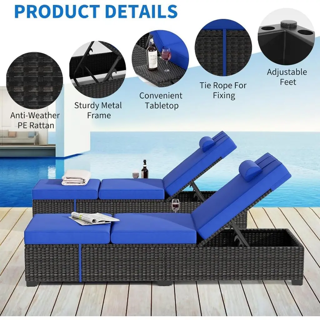Patio Lounge Chairs Set Of 2, Outdoor Wicker Rattan Lounge Chair With 6 Position Adjustable Backrest,blue