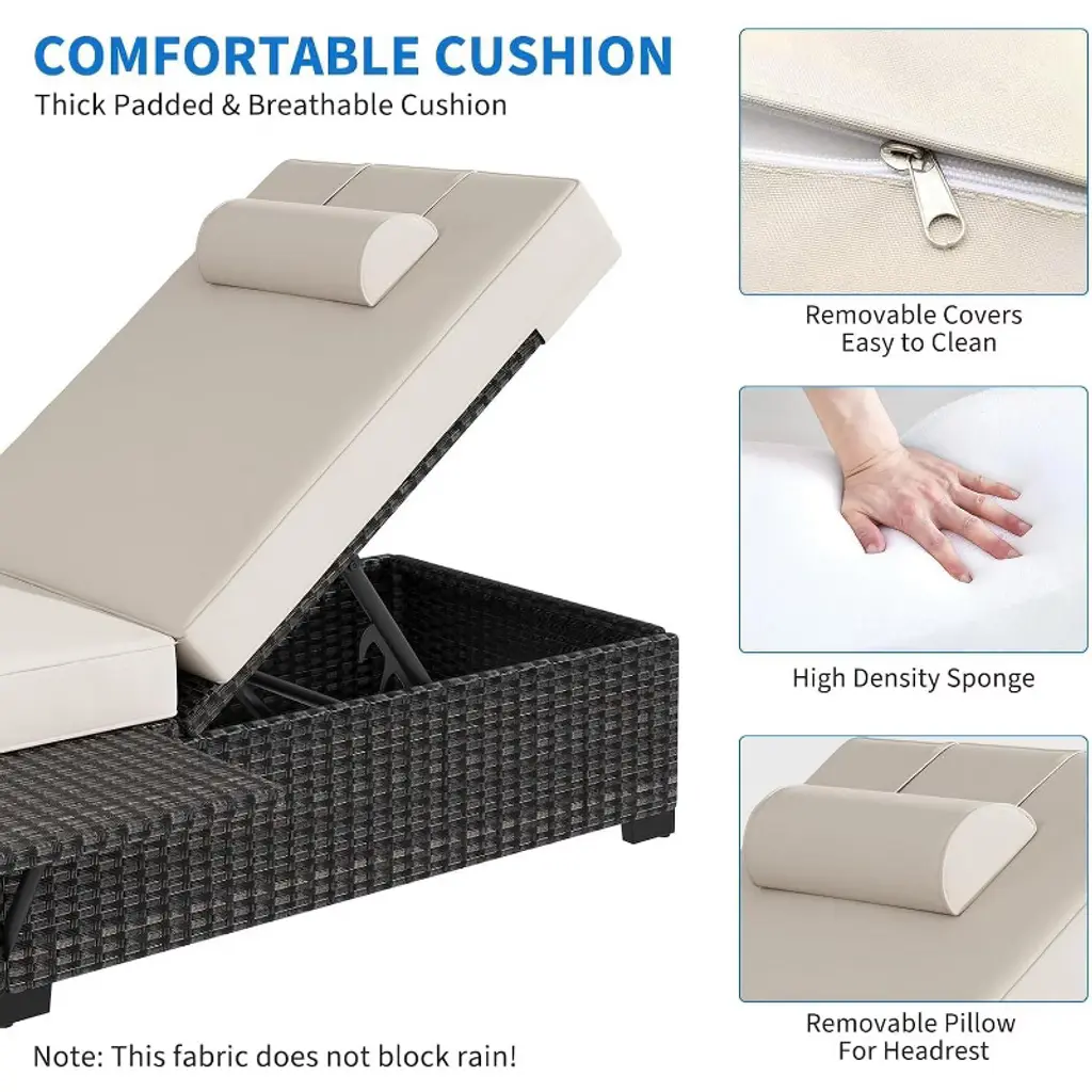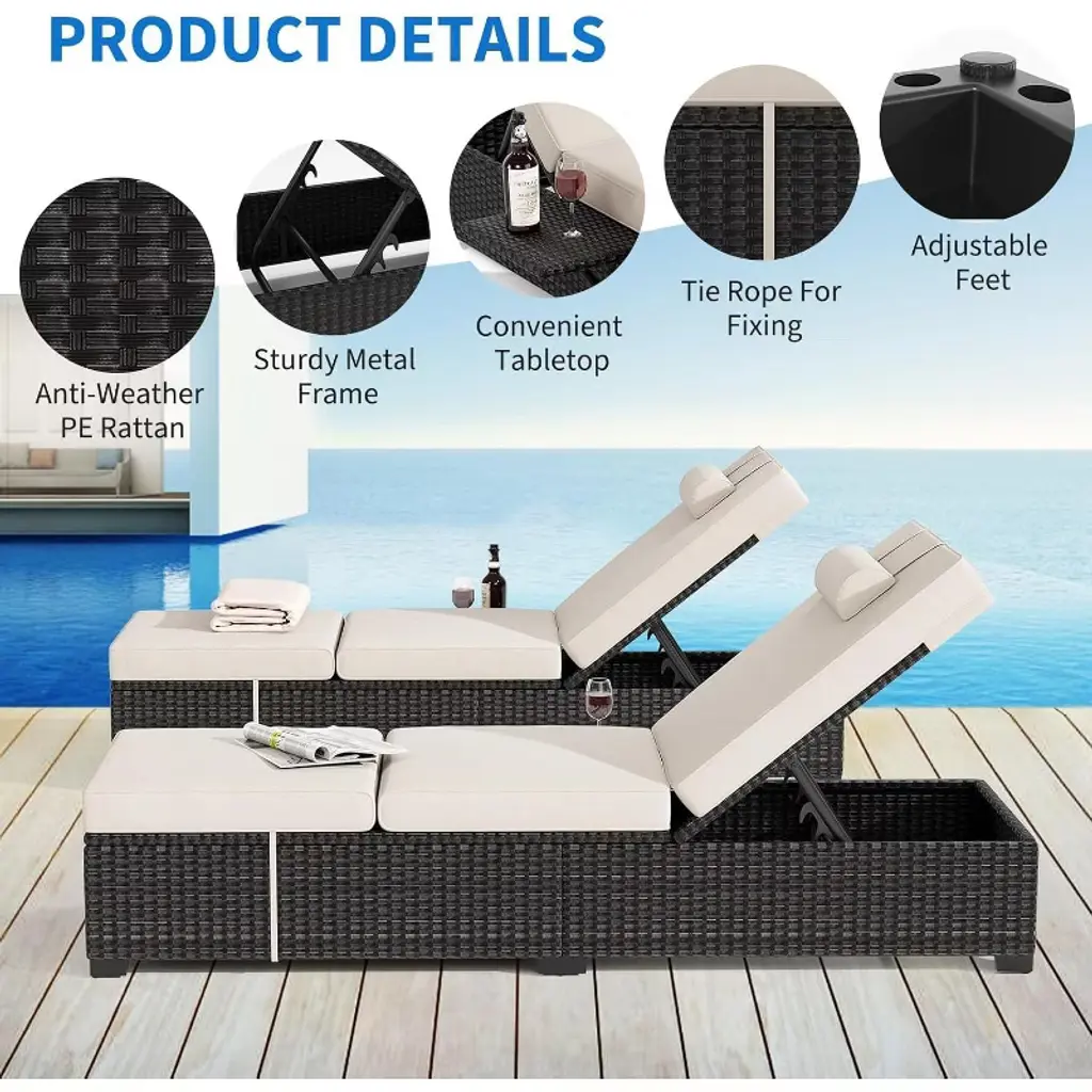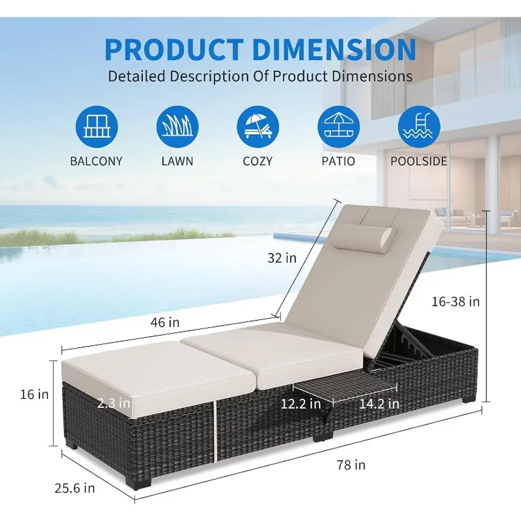 Patio Lounge Chairs Set of 2, Outdoor Wicker Rattan Patio Pool Lounge Chair with 6 Position Adjustable Backrest, Foldable Plate, Cushions and Headrest