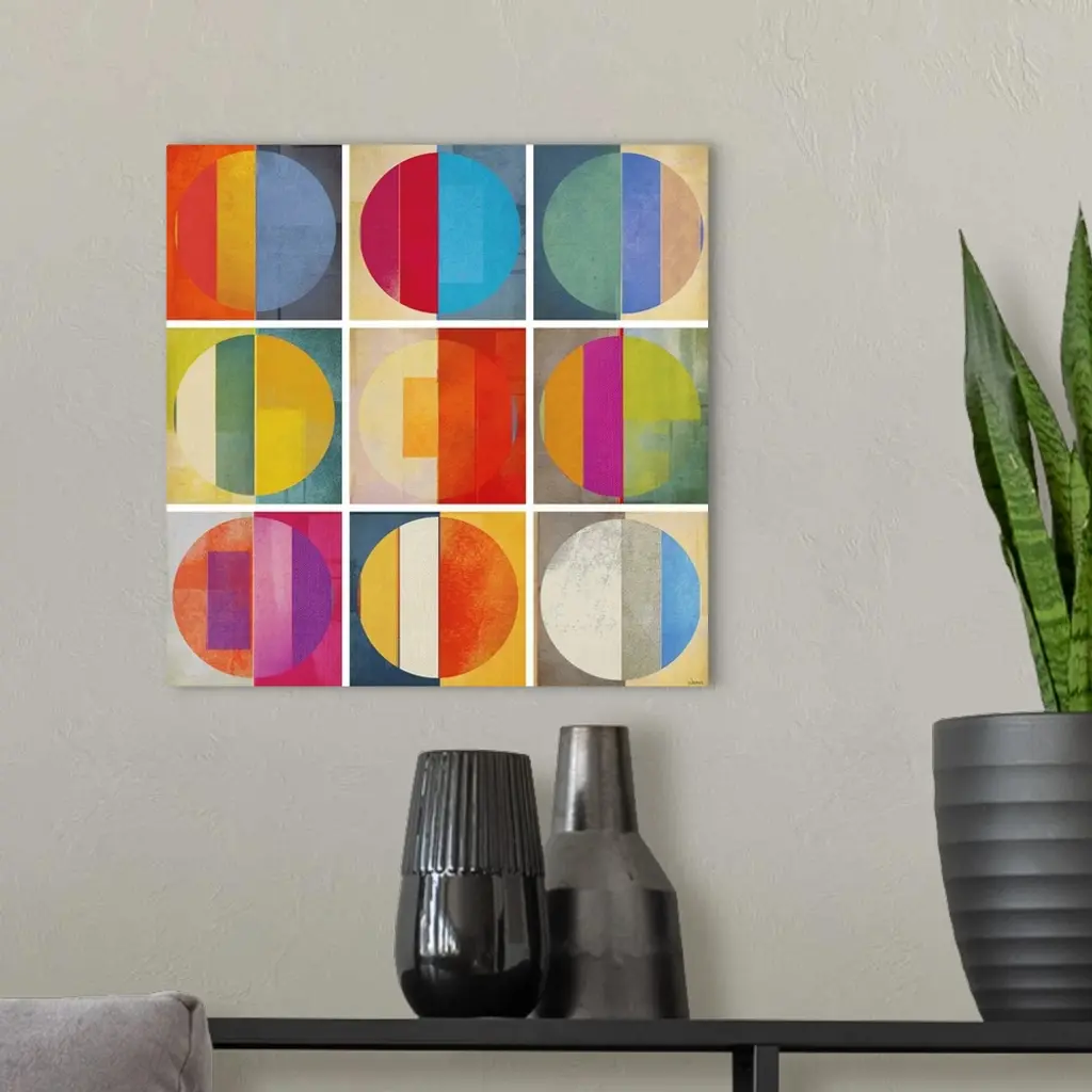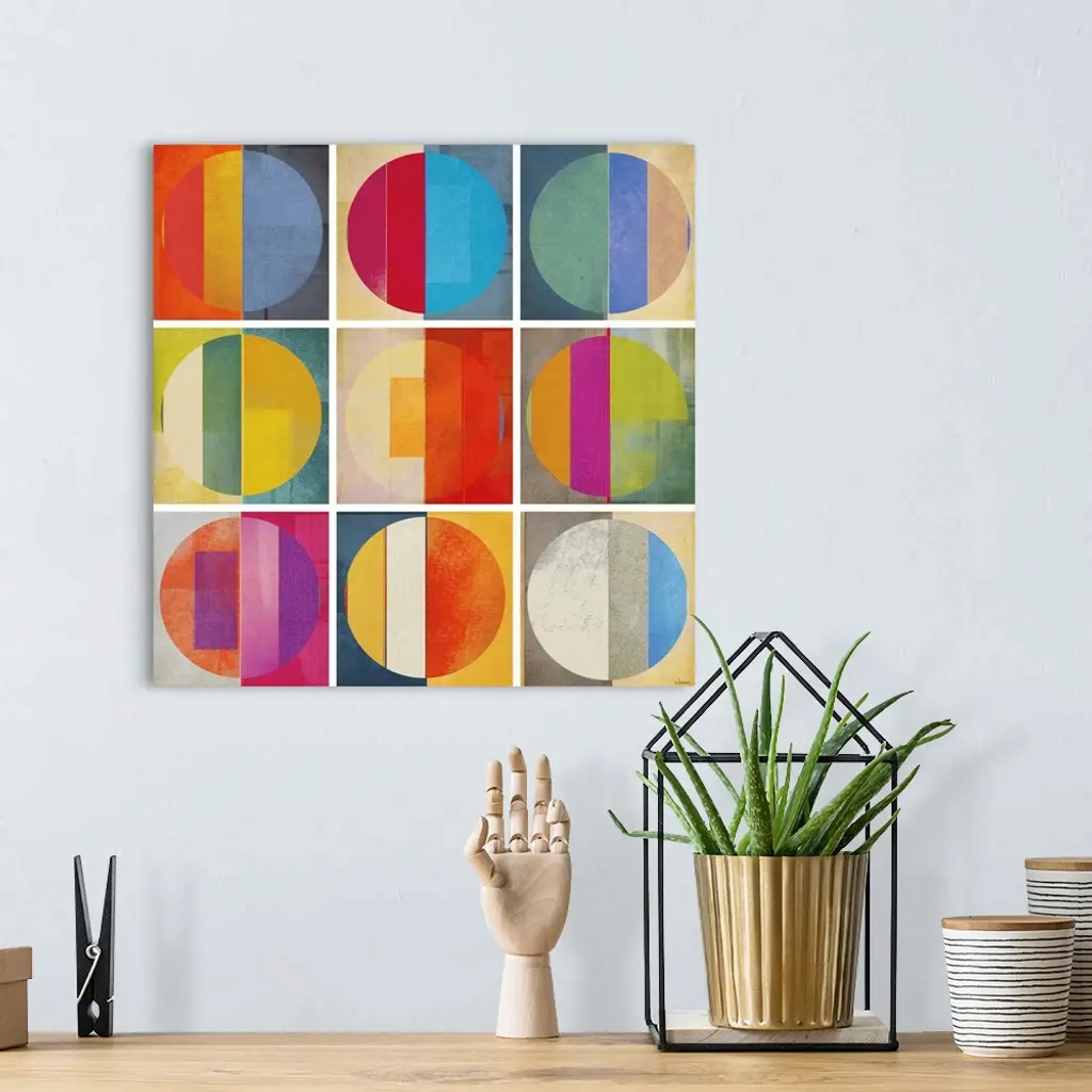 A square abstract of rows of multi-colored circles within boxes divided by white lines.
