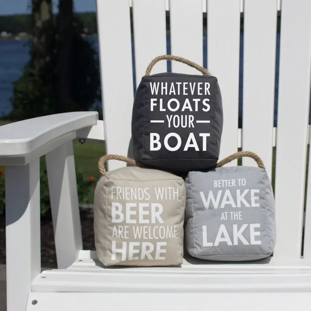 This decorative 5" door stopper is packaged in a plain box. It is made from polyester, linen, and rope and filled with sand and polyester. Best if used for interior doors, not for heavy fire doors, and weighs approximately 2 pounds. "Whatever Floats Your Boat" text is printed onto the front of the draft stopper. Wipe clean with a damp cloth. Great for gifting to a friend.