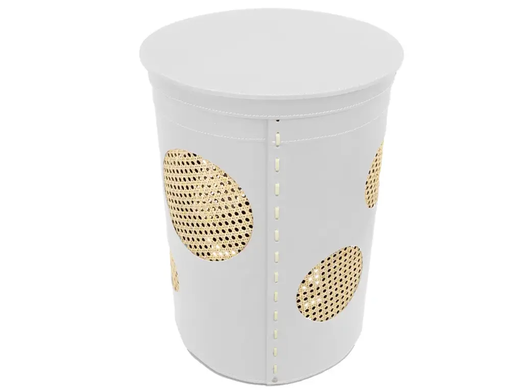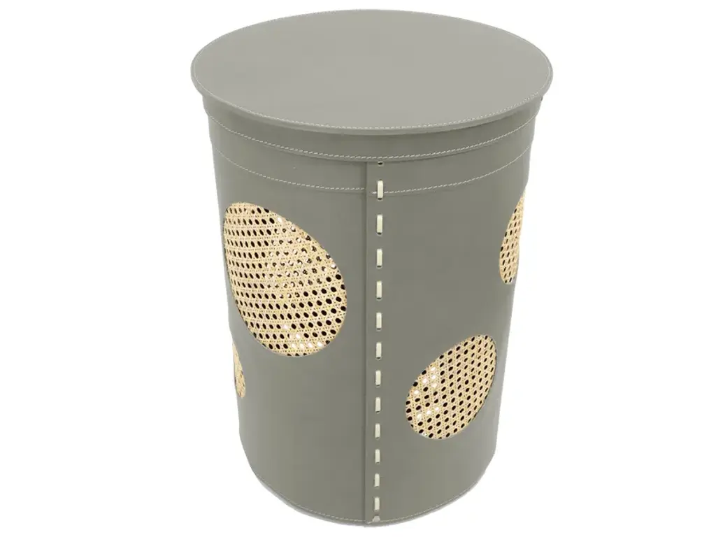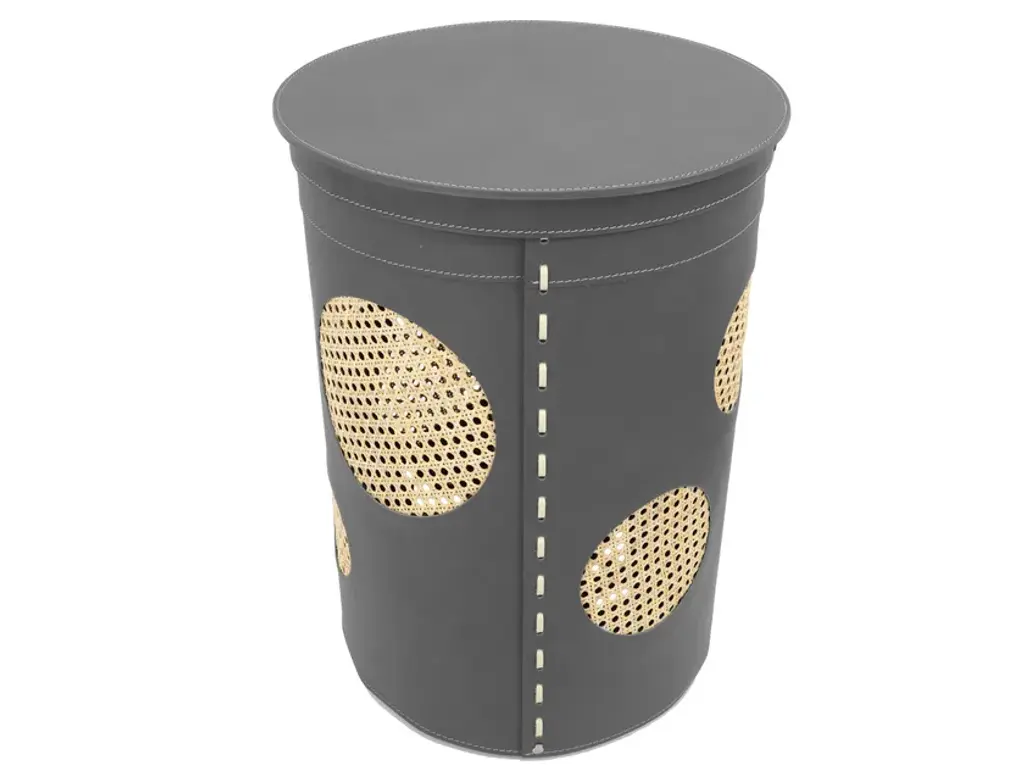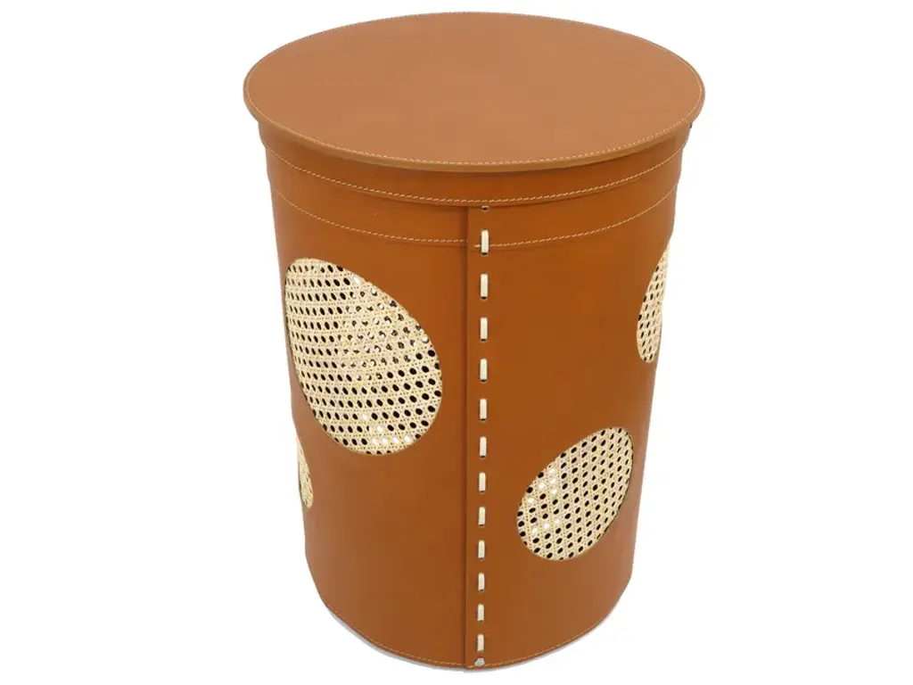 Retrò style, the cylindrical laundry basket Pavio in regenerated leather inside and out with round inserts in Vienna straw. With removable internal bag in cotton, flame in plywood with rubber feet.