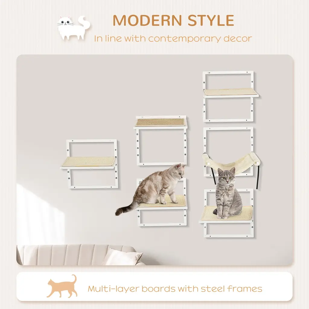 Pawhut 6-Pc Modern Cat Wall Shelves For Indoor Cats, Height Adjustable Jumping Platforms & Cat Hammock - Cream White