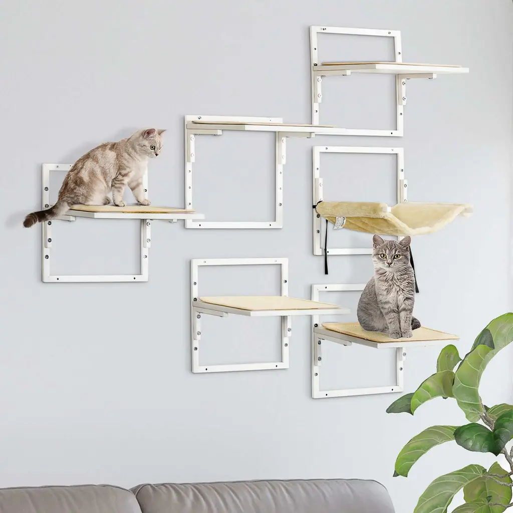 Soft Cat Hammock: A luxuriously soft, plush kitty hammock provides a comfortable cat bed, merging a super cozy space to snooze with the height cats love. The friction-textured mats on the flat platforms make it easy to jump from a surface to another. All the fabric is removable and machine washable for easy cleaning; hammock fabric included.Wall-Mounted: A wall-mounted design lets you give your fur baby extra height, allowing you to position the climbing toy by a table, ledge, couch, chair, bed, or countertop, creating a cozy spot to nap and lounge around far up above the ground.Multiple Levels & High-Stability: A healthy domestic feline adult can jump nearly 5 or 6 times their body length, about 8 feet in the air on average, and with that in mind, these 6 levels can reach your cat's potential. Our high-quality cat furniture is made to withstand big jumps and easily allow kitties up to 11 lbs. to have fun.Clean Look: With 5 platforms that are all the same, you can achieve a symmetrical look for a clean style in your living space, while assuring that the perches blend in easily next to other fabrics and colors.Cat Climbing Tree Info: Platforms: 13.75" L x 11.5" W x 13.75" H. Hammock: 13.75" L x 12.25" W x 13.75" H. Recommend Cat Weight: Up to 11 lbs.