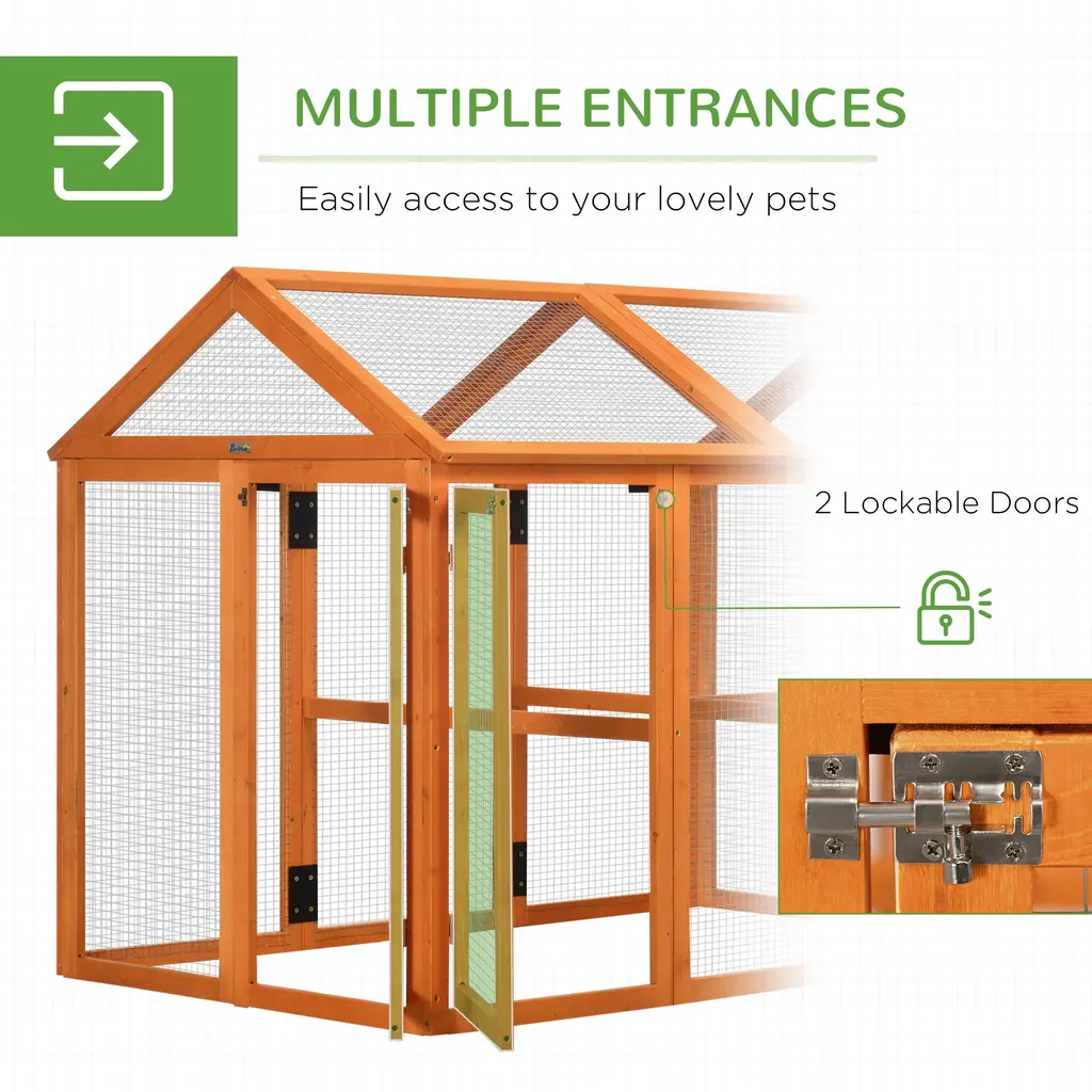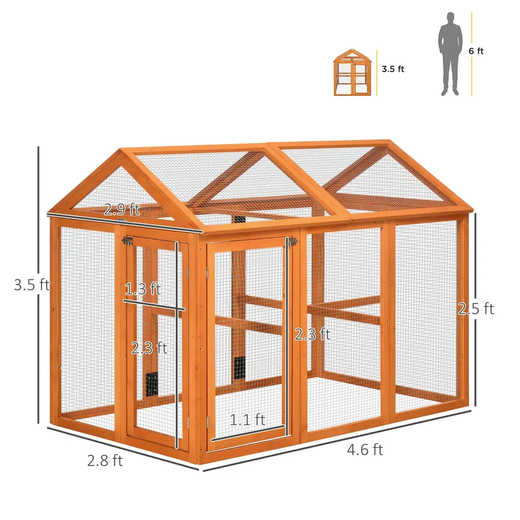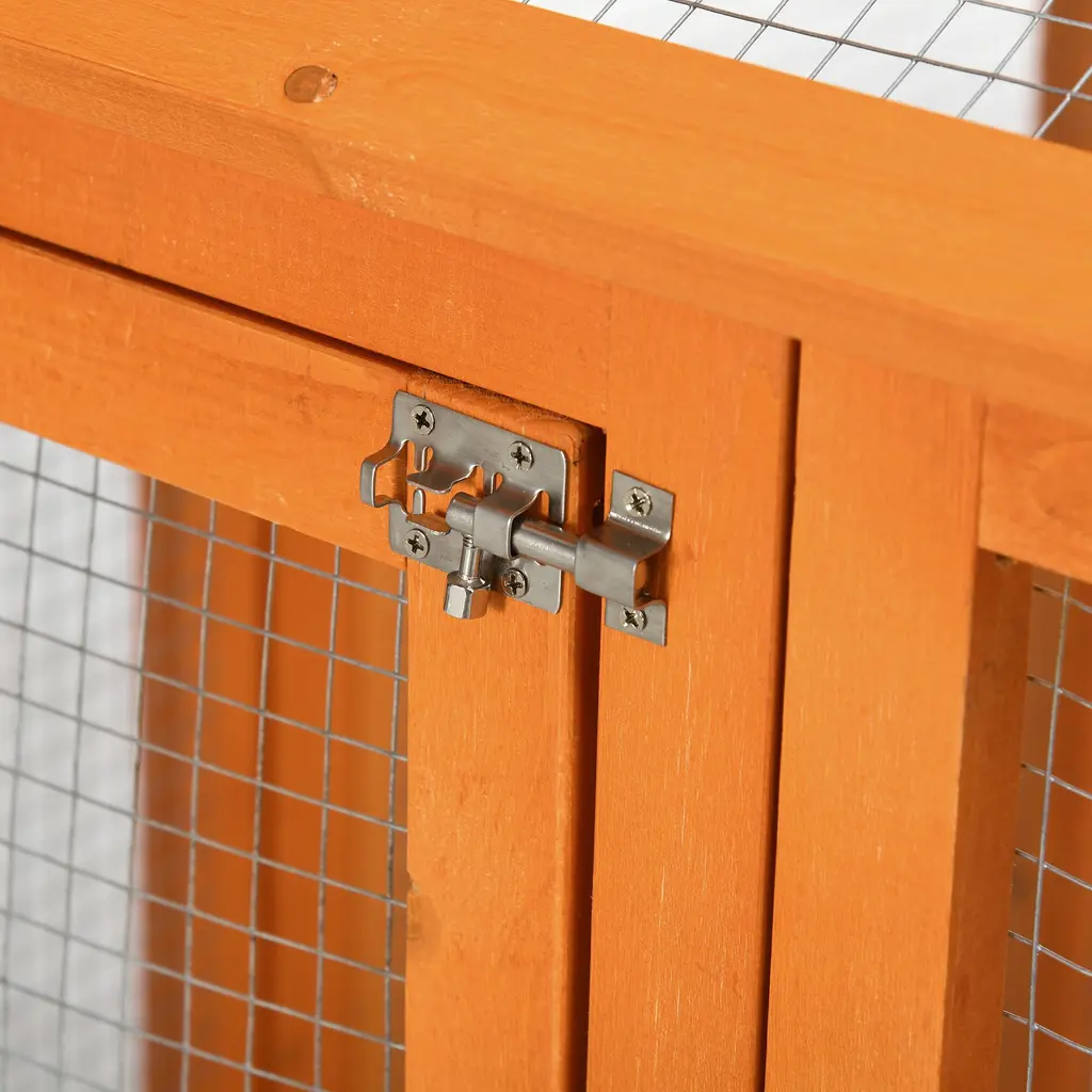 Descriptions:Discover the charm of backyard farming with the PawHut chicken coop. This large chicken coop is designed with a spacious run, ensuring your feathered friends have ample room to roam. This chicken pen combines security with freedom. Transform your outdoor space into a bustling chicken enclosure with this inviting chicken hutch.Features:● Spacious interior accommodates 1-3 chickens, ensuring comfort and well-being● Lockable doors to keep pets secure ● Mesh wire lets air flow through their space, keeping them cool and ventilated ● Purchase multiple coops to combine them, making a big coop ● Three standing poles included ● Solid fir wood frame for stability ● Assembly requiredSpecification:● Color: Orange● Materials: Fir Wood, Metal Wire● Overall Dimensions: 55.1" L x 34.8" W x 41.7" H● Perches: 21.1" L x 0.9" W x 0.5" D (Long), 8.7" L x 8.7" W x 0.5" D (Short)● Door: 13"W x 27.8" H (Front), 39.5" W x 70.5" H (Side)● Suitable for 1-3 Chickens● Item Label: D51-364V00OG