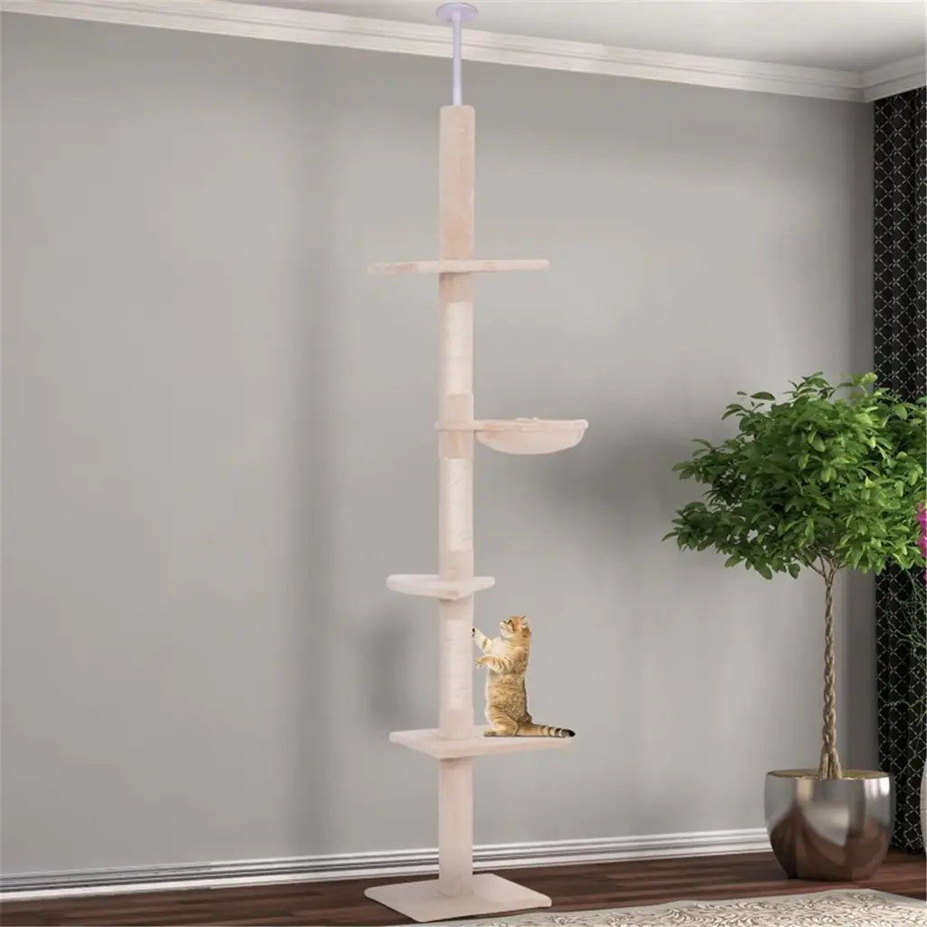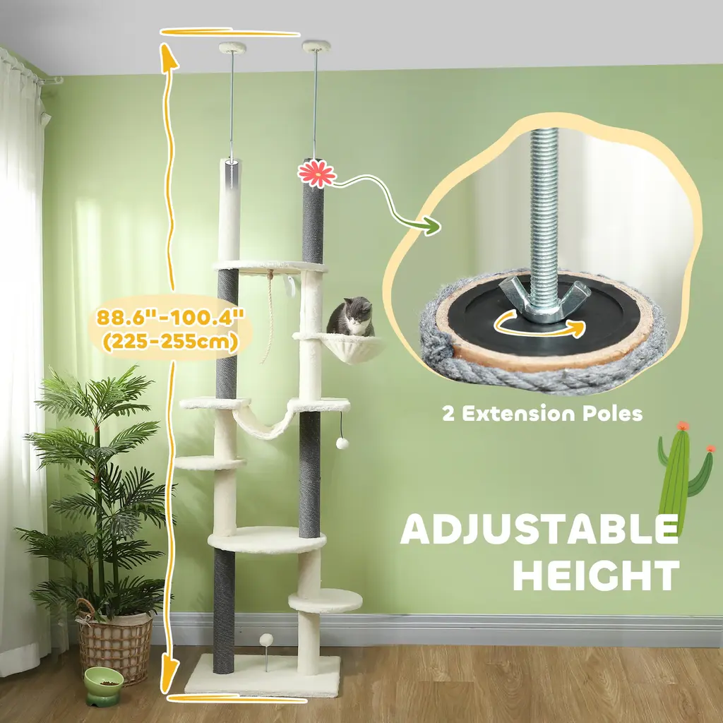 Descriptions:Transform your home into a feline paradise with the PawHut Cat Tree. This floor-to-ceiling tower adjusts from 88.6" to 100.4" high, maximizing vertical space and minimizing floor space used. It ensures stability with an anti-tip device that attaches it to the wall. It features cozy hammocks and multiple perches for a wonderful blend of fun and comfort. Covered in soft plush, it keeps cats entertained and relaxed.Features:● With an adjustable height from 88.6"-100.4", it fits various ceiling heights● Vertical, space-saving design that optimizes living area usage● Particleboard and two top discs ensure stability● It includes an anti-tip device to attach it to the wall● It lets cats relax, scratch, and climb● Soft plush covering adds comfort and style to decor● Designed for 1-2 cats under 11 lbs.● Assembly requiredSpecification:● Color: White, Gray● Materials: Particleboard, Plush, Cotton Rope● Overall Dimensions: 23.6" W x 17.3" D x 88.6" -100.4" H● Round Platforms: Dia. 11.8"● Second/Fourth Platform: Dia. 18.9"● Third Platform: 18.9" L x 9.4" W● Post: Dia. 3.3"● Hammock: Dia. 11.8" x 3.1" H (Round), 16.5" W x 7.1" D x 5.1" H (Fabric)● Base: 23.6" W x 17.3" D● Maximum Load: 22 lbs.● Item Label: D30-843V00CW