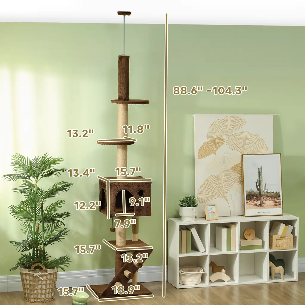 Descriptions:Transform your feline's playtime with the PawHut floor-to-ceiling cat tree. Adjustable from 88.6" -104.3" high, this vertical, space-saving cat tower features a secure, large base with an anti-tip device. It's not just a cat tree but a stylish cat condo and a scratching post that includes a soft, plush feel. Its neutral tone blends seamlessly with your decor and as it keeps kitty entertained you can rest assured your furniture will be out of harm's way.Features:● Adjustable height from 88.6" -104.3" fits various ceiling heights● Vertical, space-saving design maximizes room usability● Large base and anti-tip device enhance stability and safety● Features multiple jumping platforms and 3-steps for playful climbing● Includes scratching post to satisfy natural clawing instincts● Soft plush coverings offer comfort and match home decor● Cat condo provides a cozy napping spot● Suitable for 1-2 cats under 10 lbs., assembly neededSpecification:● Color: Brown● Materials: Particleboard, Plush, Jute● Overall Dimensions: 18.9" W x 15.7" D x 88.6" - 104.3" H● Cat Condo: 15.7" W x 13.4" D x 12.2" H● Door Hole: 7.9" W x 9.1" H● Perch: 13.2" L x 15.7" W, 11.8" L x 13.2" W (from Bottom to Top)● Post: Dia. 3.7", Dia. 2.1"● Stair: 20.1" W x 6.7" D x 15.7" H● Inclined Board Width: 4.3" W● Base: 18.9" W x 15.7" D● Maximum Load: 22 lbs.● Item Label: D30-854V00BN