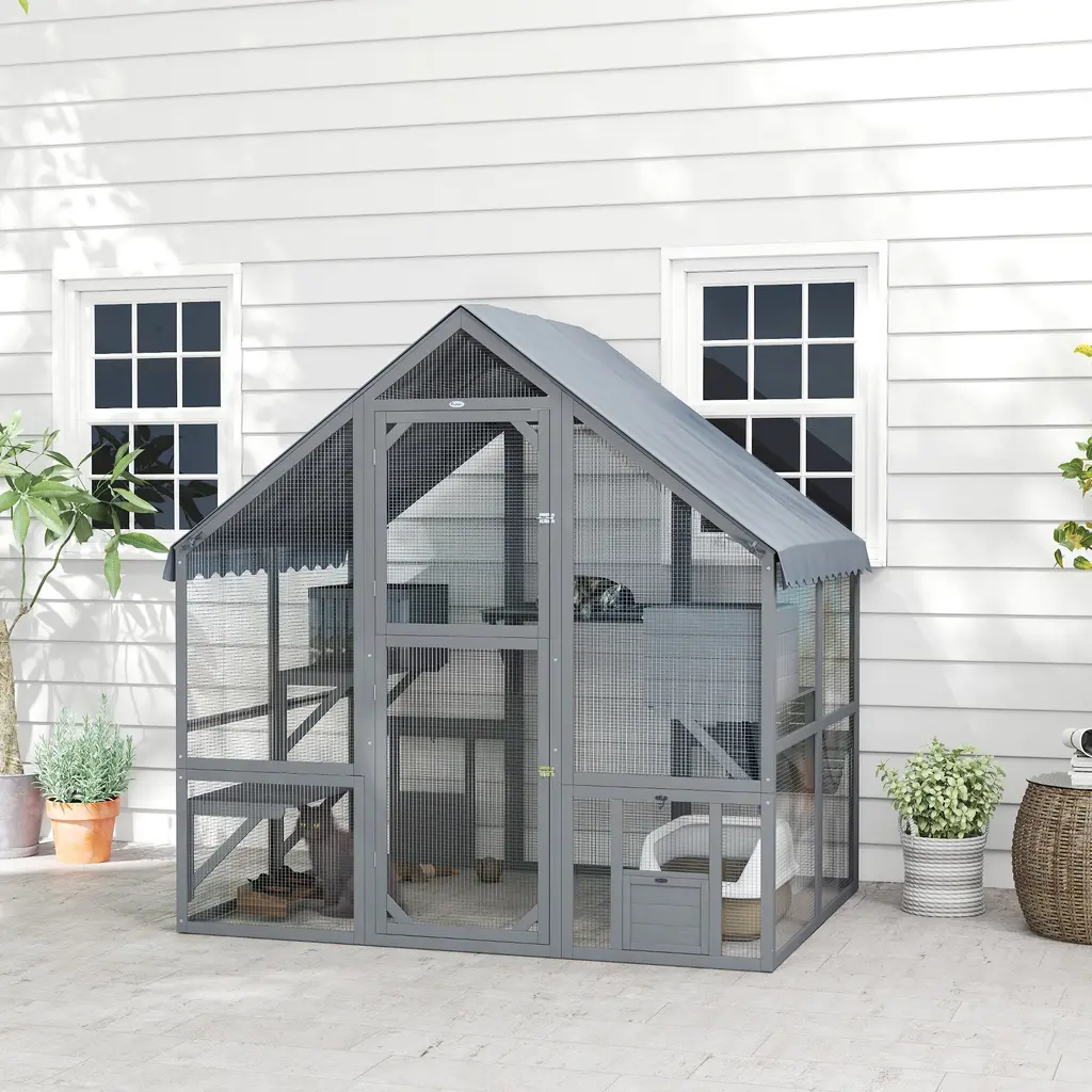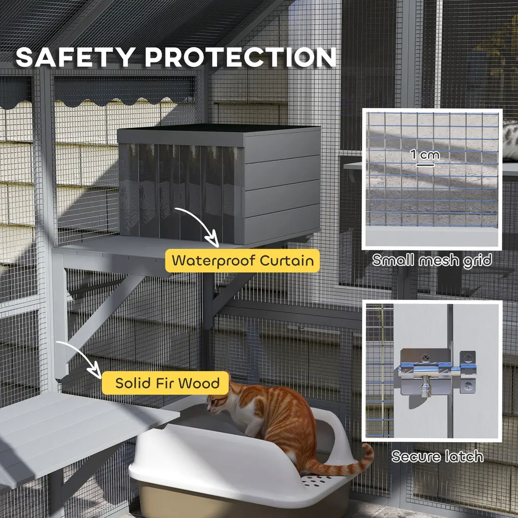 Descriptions:Transform your feline's outdoor adventures with the PawHut catio! This spacious cat enclosure features two cozy condos with curtains and four playful platforms, making it a paradise for 2 to 4 cats. Crafted from fir wood and topped with a waterproof, anti-UV cover, it's a wonderful outdoor catio for your cat to enjoy fresh air while lounging in luxury safely.Features:● Spacious size accommodates 2-4 cats for ample play● Includes two condos with curtains for cozy hideouts● Features four platforms for climbing and lounging● Soft ladder enhances accessibility and fun● Easy assembly in 80-100 minutes with two people● Constructed from fir wood with waterproof paint● 420D waterproof, anti-UV cover shields from elements● Split door design simplifies access and cleaningSpecification:● Color: Gray● Material: Fir Wood● Overall Dimensions: 73" W x 55.1" D x 74" H● Inner Space: 71" W x 53.1" D x 72.8" H● Condo: 16.1" L x 14.2" W x 10.6" H● Jumping Platform: 26.4" L x 14.6" W● Soft Ladder: 32.7" L x 12.6" W● Large Door: 21.3" W x 25" /35" H (Upper/Lower)● Small Door: 12.6" W x 8.3" H● Top Cover: 102.4" L x 55.1" W● Maximum Load: 17.6 lbs.● Item Label: D32-029V00GY