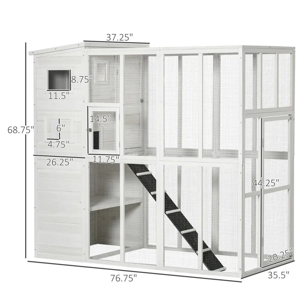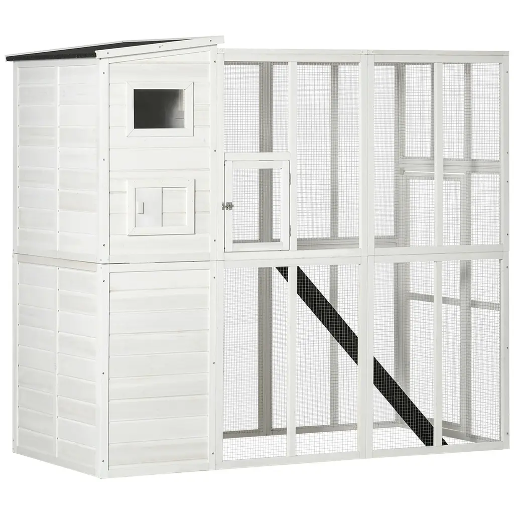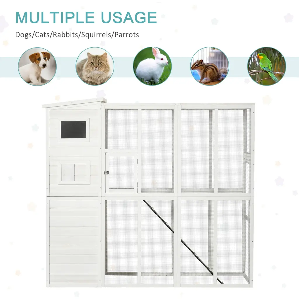 Let this fantastic Pawhut large catio allow your cat to enjoy the great outdoors without the danger of roaming free. It is built on a sturdy wood frame that allows your pet to be outside without wandering freely. The flat roof has been covered with asphalt to help weather protection and keep your pet shaded from the sun and protected from the rain. This cat kennel is perfect for single or multiple pets and can house cats, dogs, squirrels, or small to medium pets.Features:Dimensions: