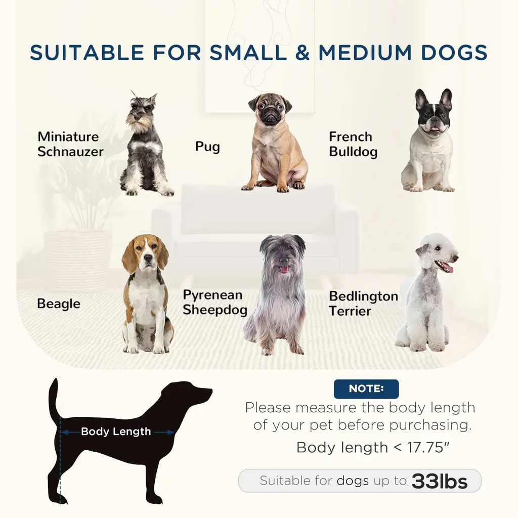 Keep Comfortable: Our pet sofa bed has a thick padded seat cushion and back cushion to lay on that keeps pets snug. The seat cover can be removed and washed, and the back cushion can be directly washed, so our fancy dog bed can be clean and cozy. Spacious Dog Sofa: Provide your pets with lots of room to lay and stretch out, keeping them happy and relaxed on a fluffy, plush place all their own. Easy to Maintain: The outer fabric is hydrophobic, so water and urine on the pet couch are easily removed with rags and paper towels, preventing stains. Safe and Secure: Constructed with multilayer board and pine wood legs, our couch for dogs is a strong and durable piece of furniture. Anti-slip footpads on the bottom make a dog couch bed that won't slide around when pets use it. Dog Sofa Bed Dimensions: 33.75" W x 21.5" D x 13.5" H. Seat: 27.25" W x 18" D x 7" H. Cushion: 27.25" L x 18.75" W x 1.5" D. Suitable for medium and small dogs up to 33 lbs. and 17.75" in body length. Assembly required.
