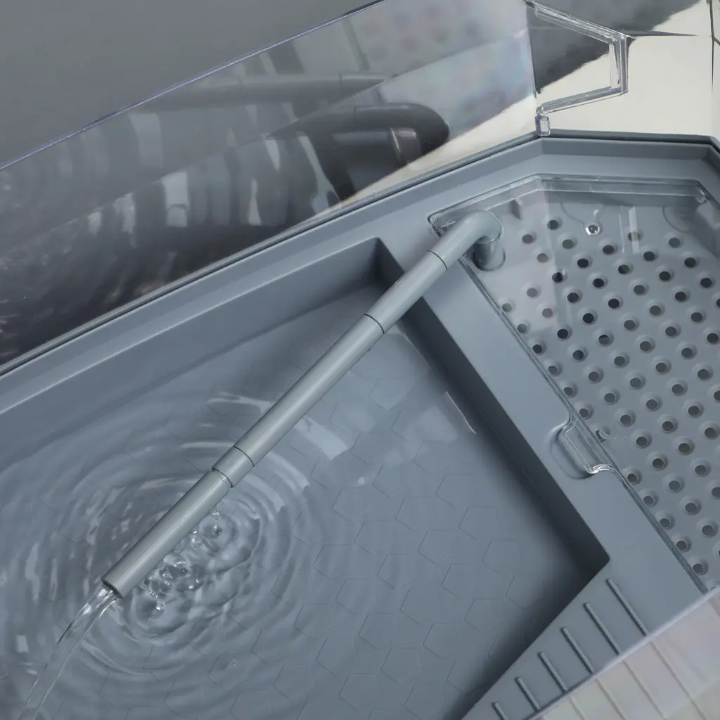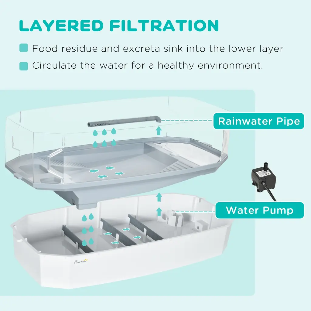 Descriptions:Our small turtle aquarium kit features a three-layer filtration system that separates the food residue, waste, and grime for a clean and happy space. A pump and pipe make the water flow and move to mimic the streams and rivers of a natural outdoor environment. The small turtle tank provides a more comfortable cage to bask, swim, and exercise in. 5" tall walls keep your reptilian friend safe inside, where they'll stay out of danger. Transform your turtle's space into an aquatic oasis with PawHut.Features:● Ultra-clean water with a three-layer filtration system for a happy fresh environment● Pump and pipe circulate the water to mimic natural streams and rivers● 5" tall wall keeps your pet safe from hazards outside the aquarium● Includes an area for feeding, basking, climbing, diving, swimming, and hatching/plants● Bottom with drainage holes for convenience● Assembly requiredSpecification:● Color: White● Material: Polypropylene, PC● Overall Dimensions: 24.5" L x 12.25" W x 9" H● Diving & Swimming Area Dimensions: 11" L x 13.75" W x 1.5" D● Climbing Area Dimensions: 6.25" W● Feeding & Basking Area Dimensions: 10.25" L x 4.25" W● Green (Hatching) Area Dimensions: 10.25" L x 5.5" W● Bottom Layer Dimensions: 24.5" L x 12.5" W x 3.75" H● Side Panel Height: 5" H● Suitable Turtle Dimensions: Maximum 2" W● Voltage: AC 120V, 60Hz● Item Label: D40-032V80WT