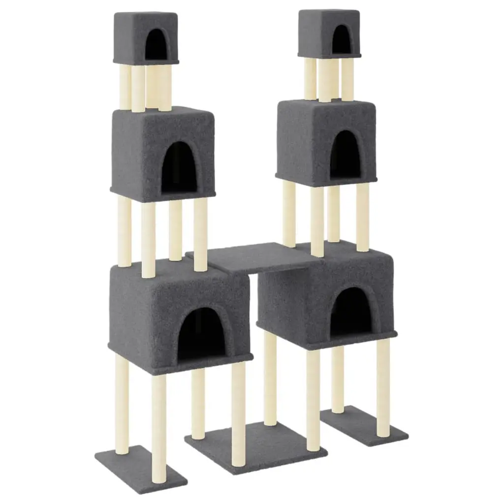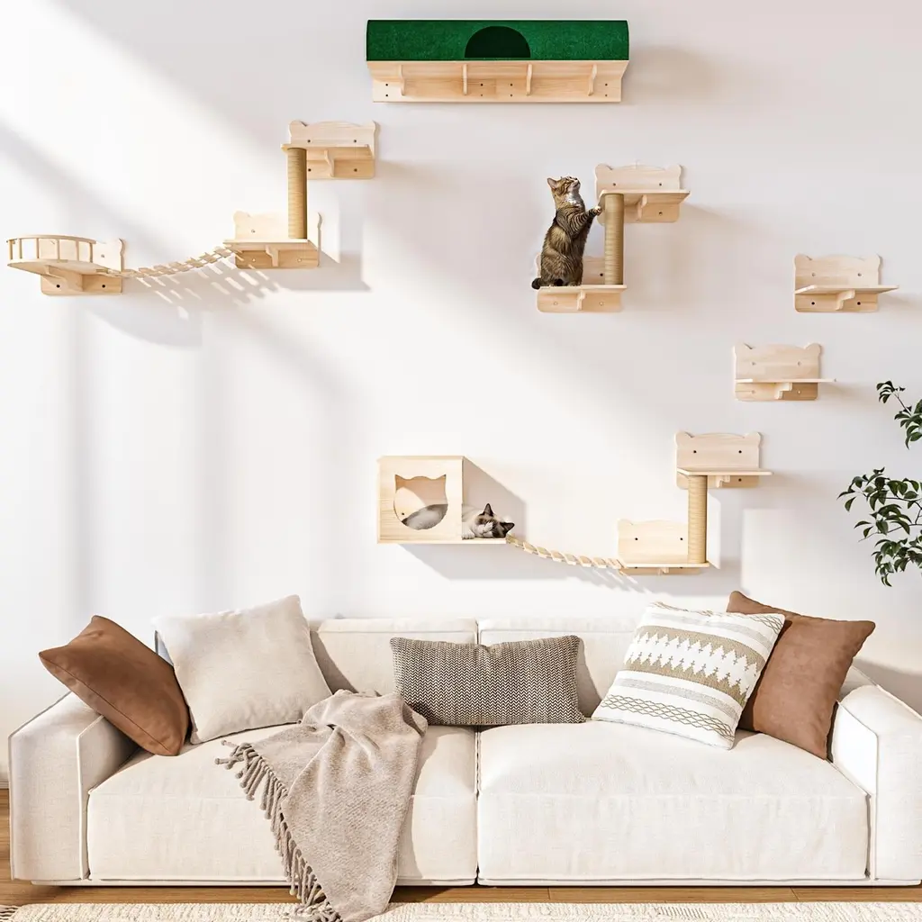 Multiple Levels: Customize this wide variety of platform styles to your cat's liking. A healthy domestic adult feline can jump nearly 5 to 6 times their body length, about 8' in the air on average; with that in mind, these 10 levels can adjust in a huge number of ways to reach supreme heights. Jumping perches in multiple shapes give your kitty tons of options for a more fun set-up.Comfortable & Soft: Soft padding on each surface make for a cozy, cat-friendly environment. Two platforms are curved for an ergonomically comfortable design to lay on. Each pad is machine washable for easy cleaning.Cat House: A cute and classic house shape adds stylized flair just about anywhere. This box is cushioned inside and features three holes so you can set your climbing toy up in any way, and your furry friend will be able to get into the hideout from wherever they are.High-Stability Cat Furniture: Our high-quality cat furniture is made for to withstand running and jumping without shaking or breaking.Wooden Cat Tree Info: Curved Perches: 17.5" L x 13" W x 3.5" H. Steps: 43.75" L x 12.5" W x 31" H.Cat Condo: 15.75" L x 12.75" W x 17.75" H. Cylindrical Jumping Perches: 6" L x 13" W x 3" H. Recommended Cat Weight: Up to 10 lbs.