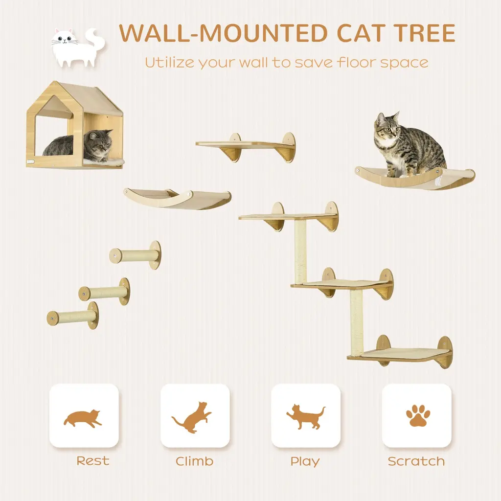 Pawhut Unique Cat Tree Made From Cat Shelves With 10 Levels For More Height, Wall-Mounted Cat Tree Climbing Playground - Oak