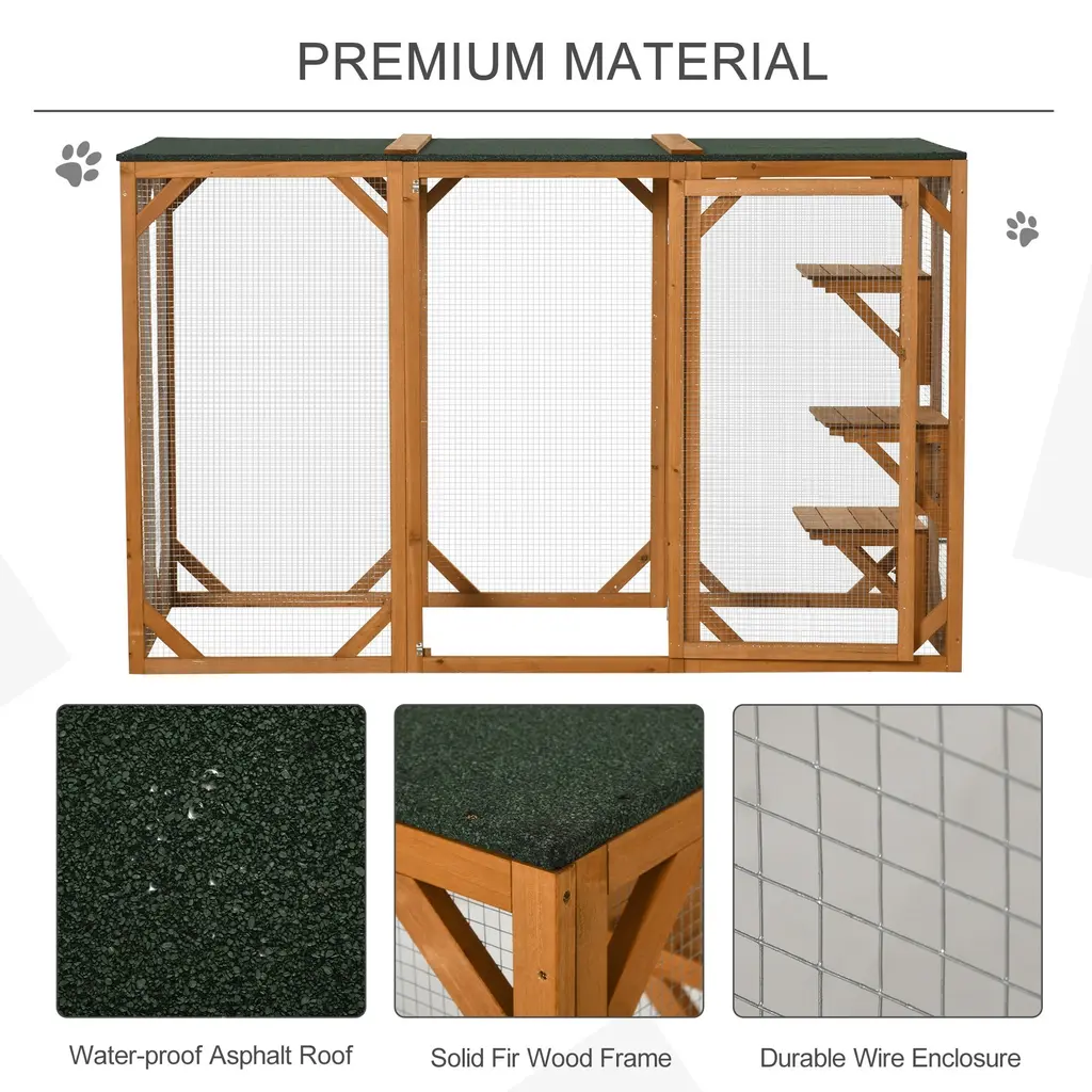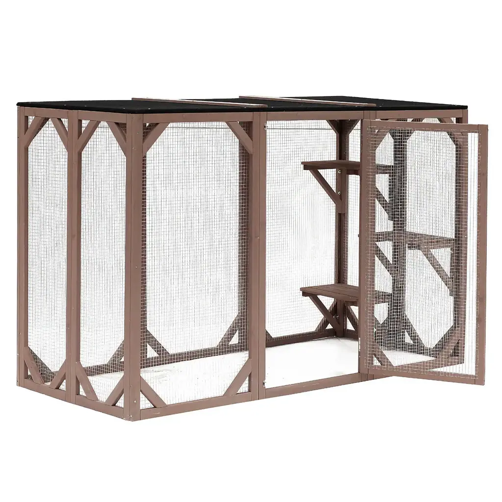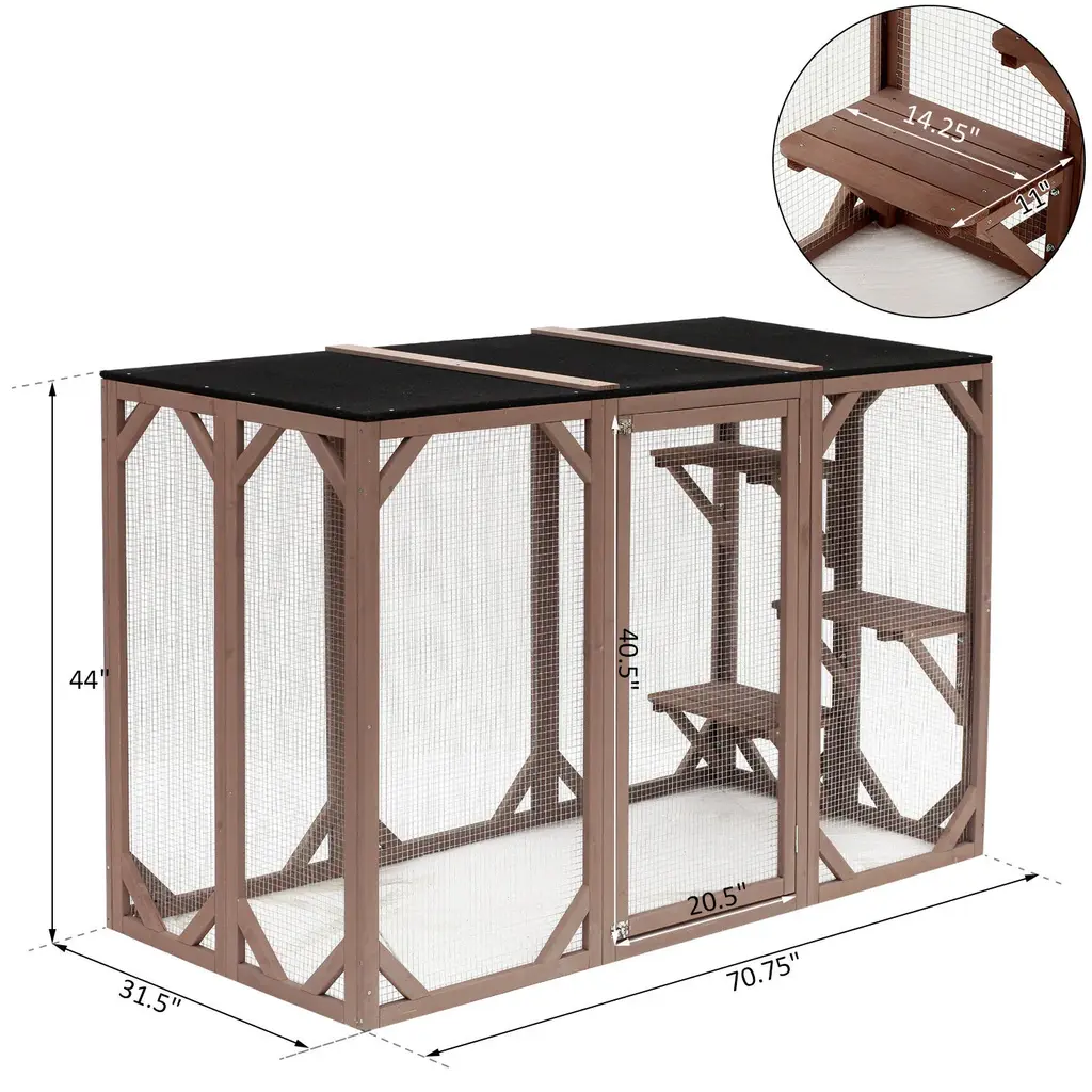 This PawHut catio allows cats to enjoy the fresh air and stay protected from hidden dangers. Our cat enclosure serves as both a secure and comfortable sanctuary for your furry family members. Three platforms allow your cats to climb and lounge while the roof has been covered with weather-resistant asphalt, protecting from the elements. This cat playpen can establish or complete an outdoor setup and keep your furry friends safer and more comfortable outside.Features:Specifications: