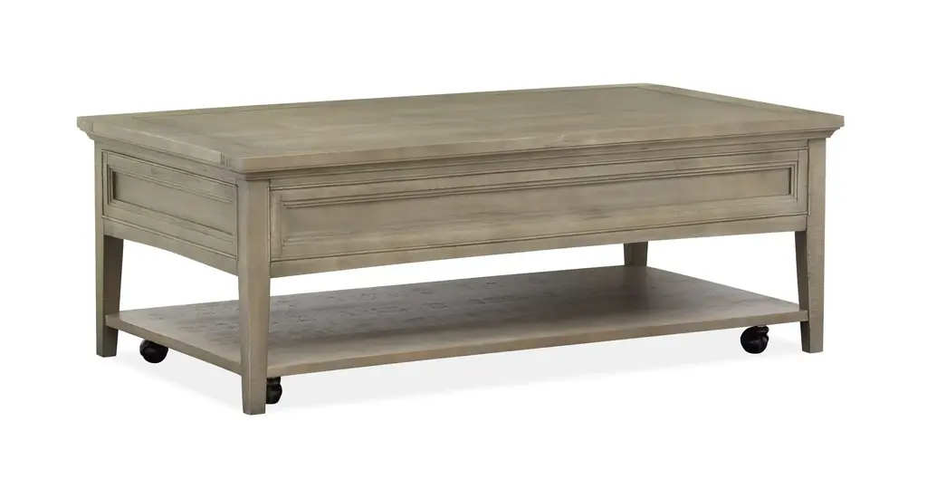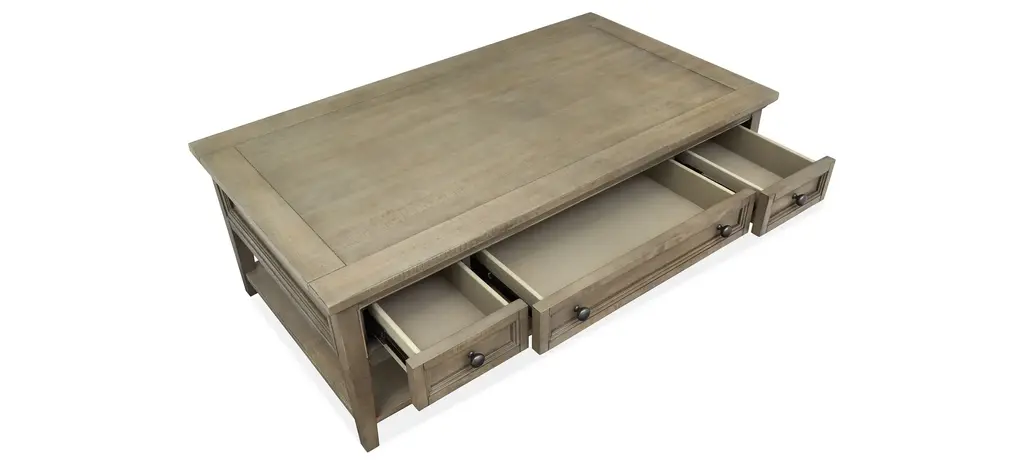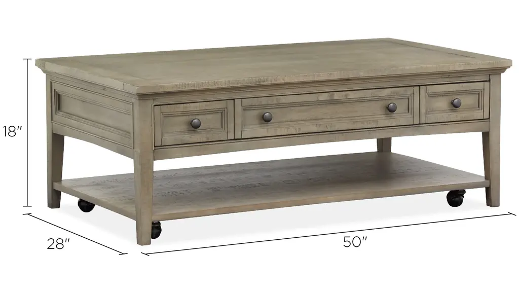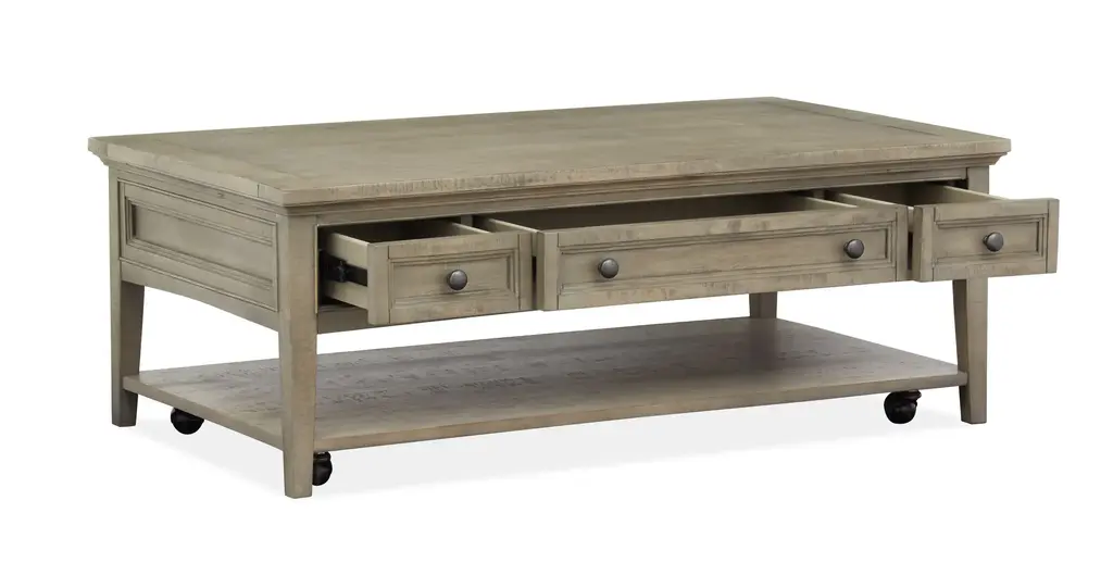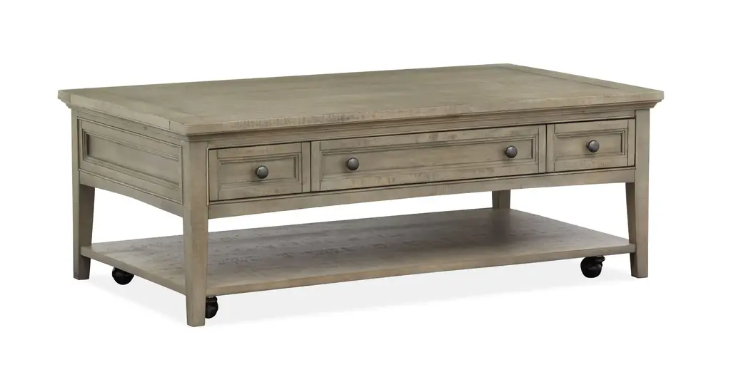 Stylish and sophisticated, the Paxton Place coffee table with casters combines classic silhouettes with tasteful details. Finished in a dreamy dovetail gray with weathered bronze drawer hardware, this table makes the perfect mate to your favorite sofa, sectional or chair. Designed to maximize space and functionality, the table boasts storage and display options that add distinctive character to a space. Choose this Paxton Place coffee table to finish off your design plan and then sit back and relax in style.