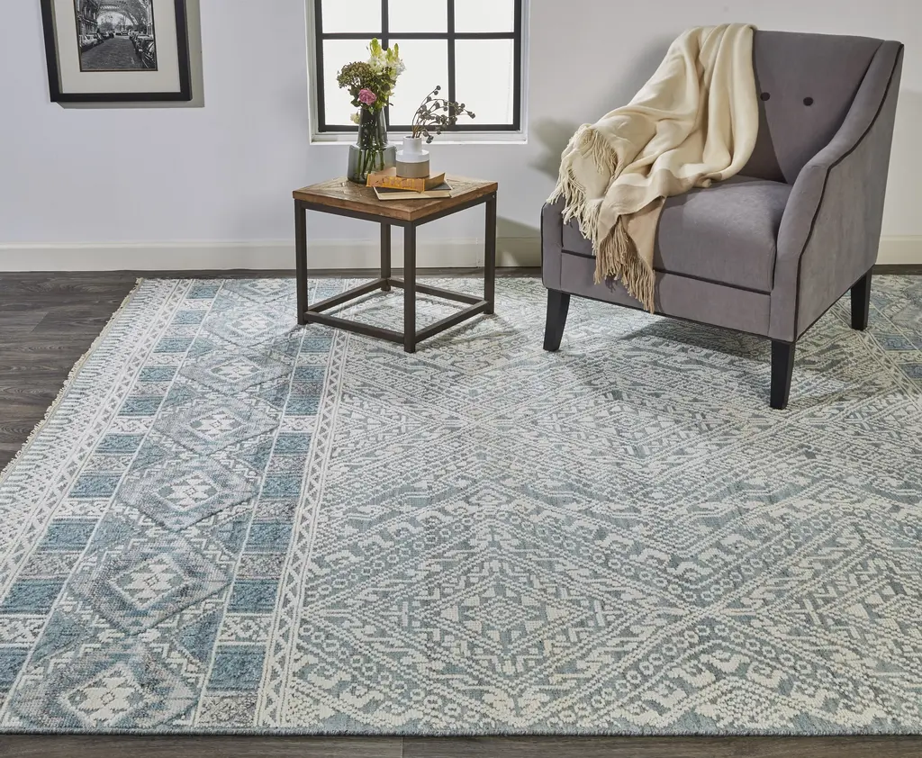 Collection: Payton Colors: Ivory, Blue, Gray Construction: Hand Knotted Material: Face: Viscose, Wool / Warp: Cotton Pile: Low Pile Pile Height: 0.31" Styles: Transitional,Farmhouse,Scandinavian Backing: Cotton Made In: India Thickness: 0.31" Price Range: $$$$$ (Premium)
