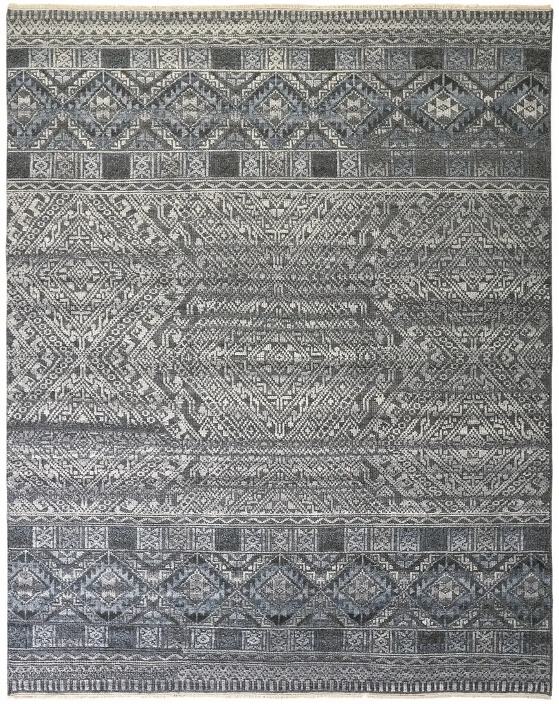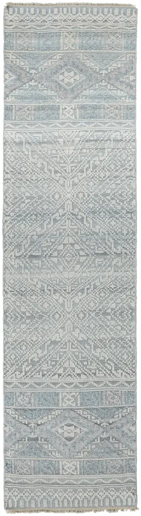 Collection: Payton Colors: Ivory, Blue, Gray Construction: Hand Knotted Material: Face: Viscose, Wool / Warp: Cotton Pile: Low Pile Pile Height: 0.31" Styles: Transitional,Farmhouse,Scandinavian Backing: Cotton Made In: India Thickness: 0.31" Price Range: $$$$$ (Premium)