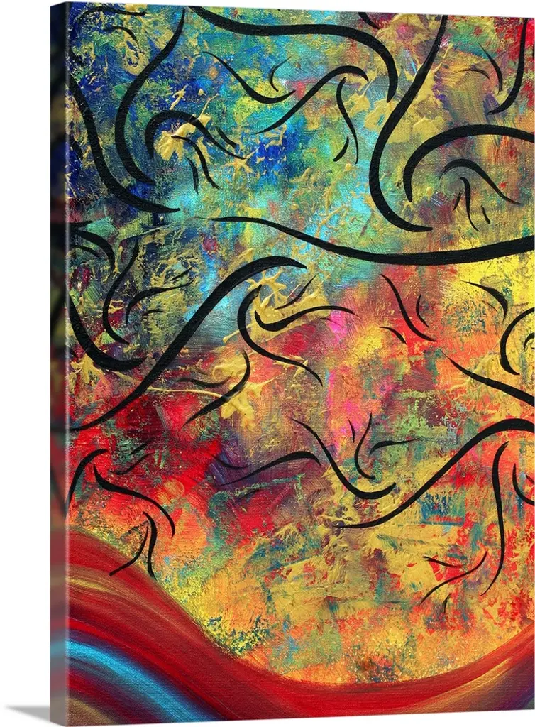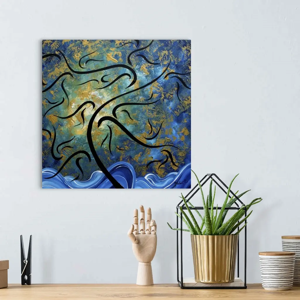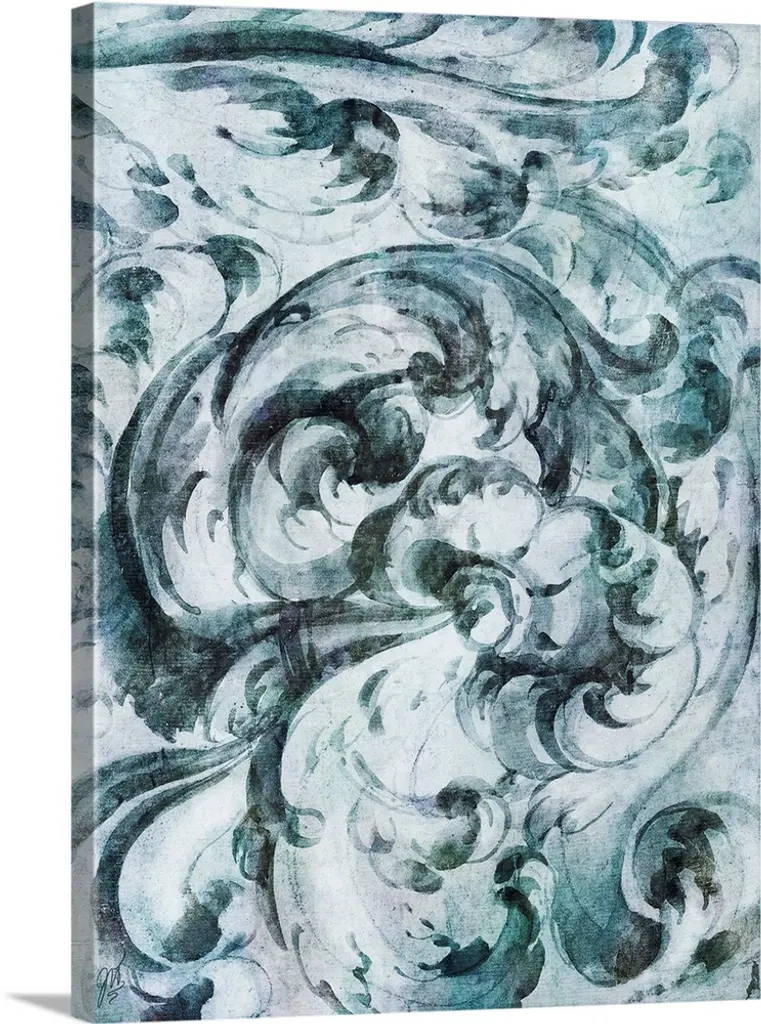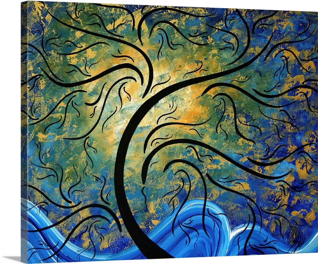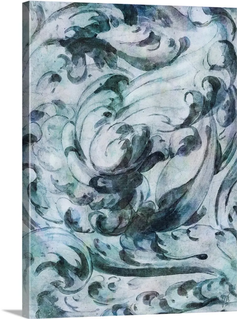 Contemporary abstract art of ocean waves and a leaf filled sky blowing in the breeze.